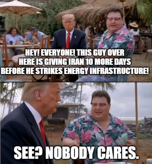 So he's delaying the strikes, but the strait is still closed and the production facilities are still getting hit.Isnt the status quo pretty good for Iran? Another week of a slow bleed will get us into a serious correction territory