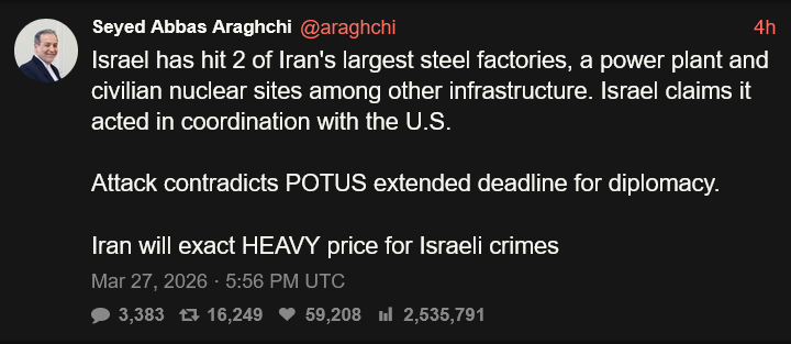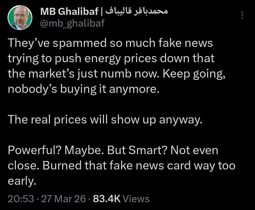 >US @SecRubio told G7 the US is NOT expecting the Strait to re-open 2 traffic as usual by end of war. "After this thing ends...one of the immediate challenges we’re going to face is an Iran that may decide that they want to set up a tolling system in the Strait of Hormuz” imagine doing all this war stuff only for Iran to be in an even better position LMAO