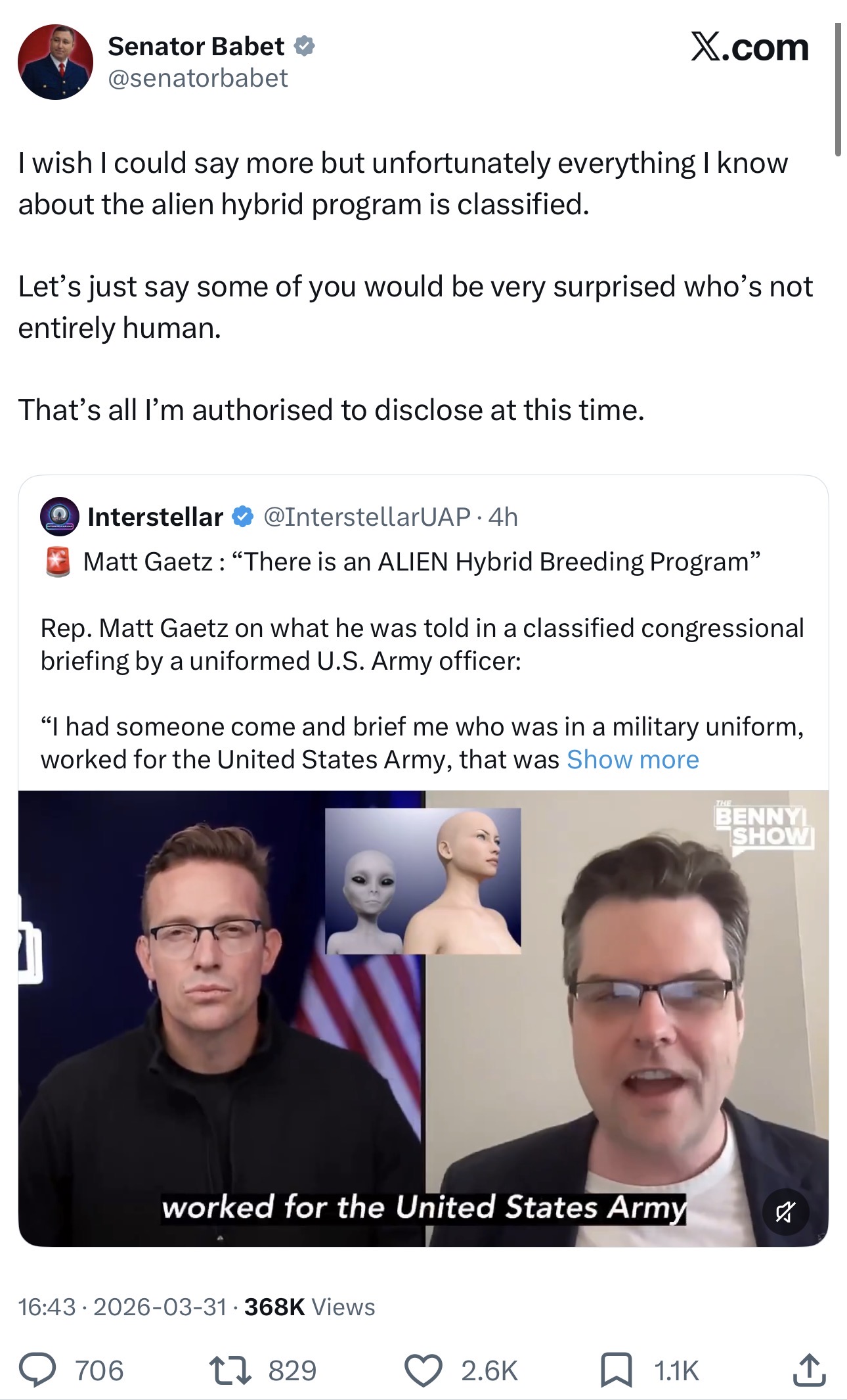 >congressman Matt Gaetz claims the US has a hybridization breed program with aliensWhat are the financial implications of the government flying UFOs everywhere? Or aliens stopping nukes from flying?