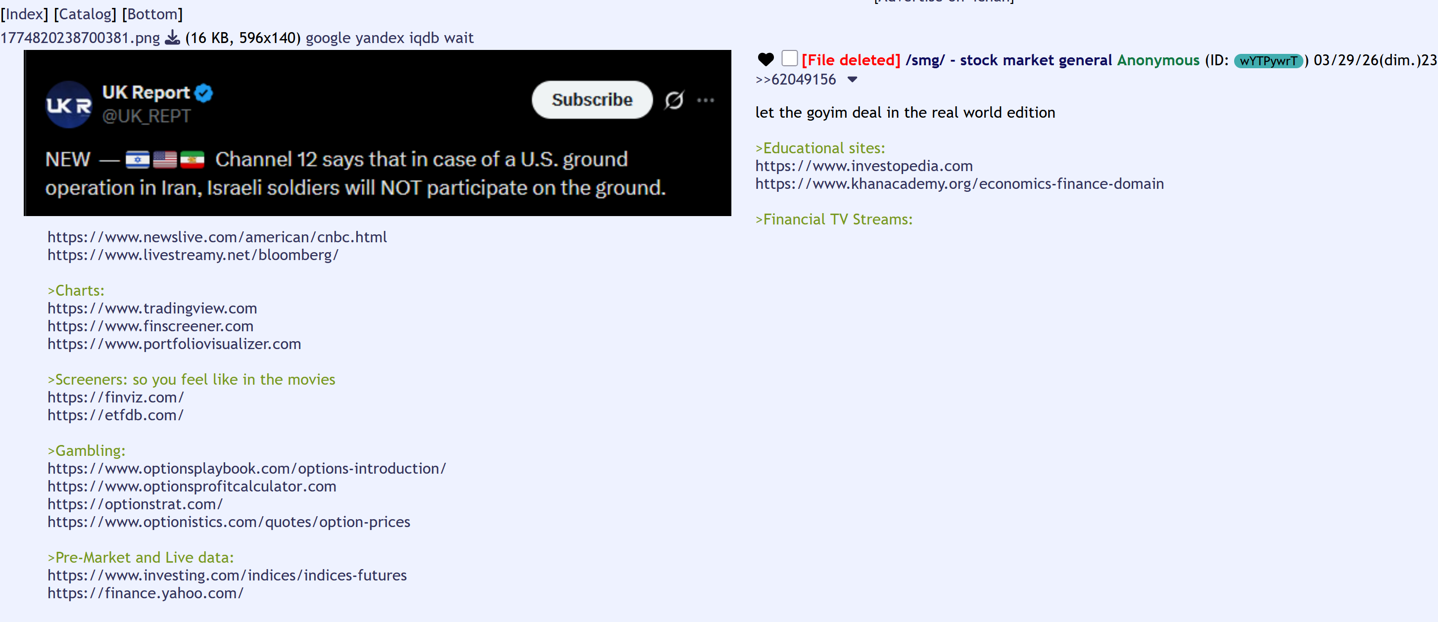 let the goyim deal in the real world edition>Educational sites:https://www.investopedia.comhttps://www.khanacademy.org/economics-finance-domain>Financial TV Streams:https://www.newslive.com/american/cnbc.htmlhttps://www.livestreamy.net/bloomberg/>Charts:https://www.tradingview.comhttps://www.finscreener.comhttps://www.portfoliovisualizer.com>Screeners: so you feel like in the movieshttps://finviz.com/https://etfdb.com/>Gambling:https://www.optionsplaybook.com/options-introduction/https://www.optionsprofitcalculator.comhttps://optionstrat.com/https://www.optionistics.com/quotes/option-prices>Pre-Market and Live data:https://www.investing.com/indices/indices-futureshttps://finance.yahoo.com/>Calendarshttps://www.marketwatch.com/economy-politics/calendarhttps://www.earningswhispers.com/calendarhttps://www.cmegroup.com/trading/interest-rates/countdown-to-fomc.htmlhttps://www.mortgagenewsdaily.com/data/building-permits>Boomer Investing 101: so zoomers with meme stocks can outperform youhttps://www.bogleheads.org/wiki/Getting_startedhttps://www.sec.gov/search-filings>Misc smg:https://www.financialjuice.com/homehttps://finance.yahoo.com/trending-tickershttps://market24hclock.com/https://www.dividendchannel.com/drip-returns-calculatorhttps://brokerchooser.com/https://www.chathamfinancial.com/technology/us-market-rates>NEW THREAD: Copy-paste the following when making a new thread:https://pastebin.com/GfB48W5Gprevious smigger thread>>62048500