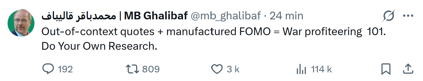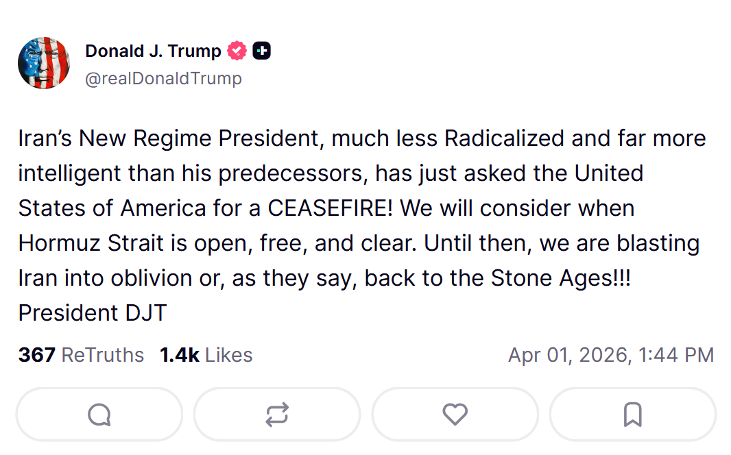 >“We will consider when Hormuz Strait is open, free, and clear. Until then, we are blasting Iran into oblivion or, as they say, back to the Stone Ages!!!”truly a modern day diplomat