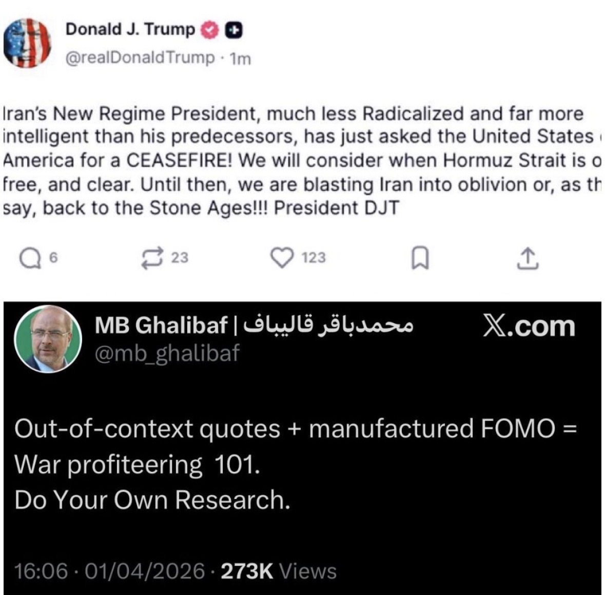 >BREAKING: Iran's Foreign Ministry responds after President Trump claims they asked for a ceasefire today:>"President Trump's claims that Iran requested a ceasefire are false and baseless."
