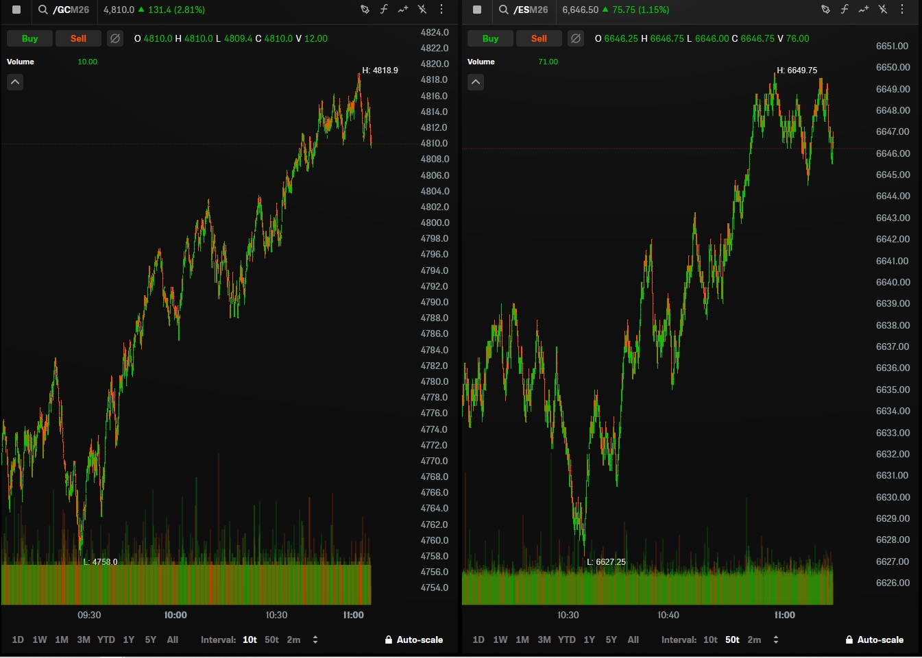 If you account for the /es having 5x the volume as /gc they have been trading exactly the same today. Idk what to do with that information.