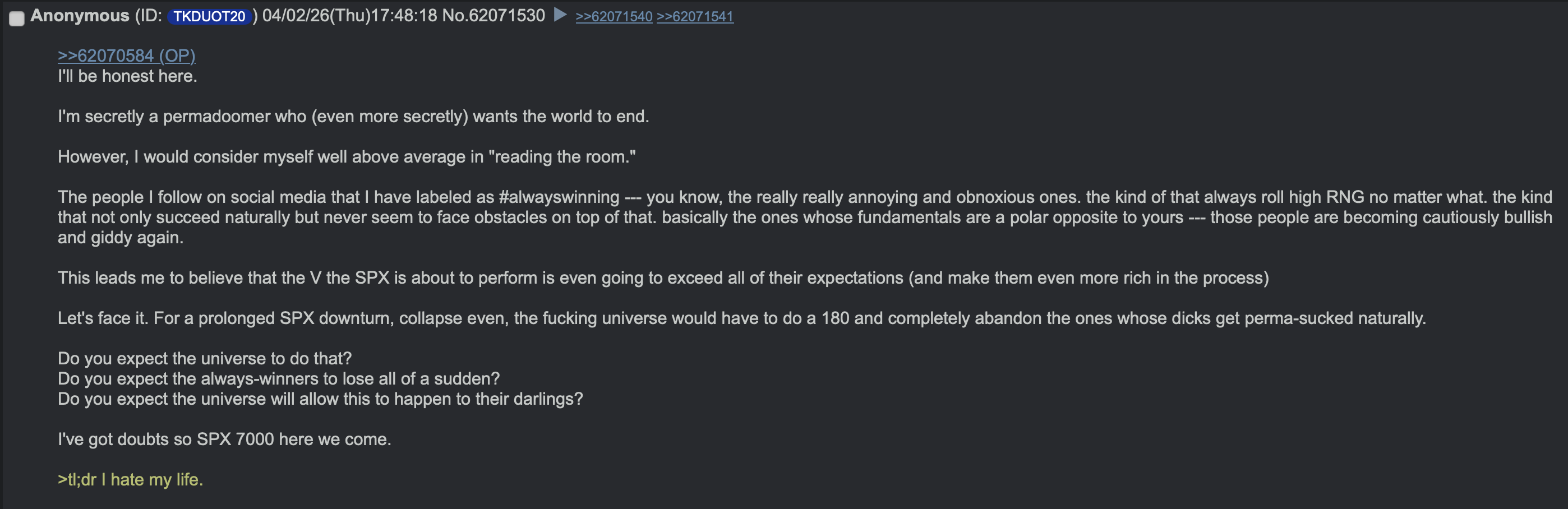 >>62071635You should always be bullish, with a little bearish hedge when things get nosebleed high like the ATH in September, you'd be happy the last 6 months of bleeding crab.This will unironically be over with in 2 more weeks. Then we hit S&P 7,500 and bears capitulate, then 8,000.