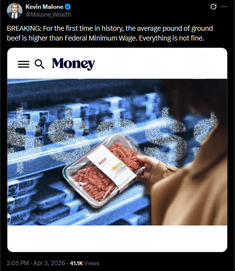 >>62074898my local walmart has started putting the 50/50 pork/beef hamburger in front of the actual hamburger. i bet CPI considers it a valid substitute and doesnt track hamburger, just hamburger cut with 50% pork now.my solution, and something I know all real american patriots can get behind, is more tax cuts and money to israel.