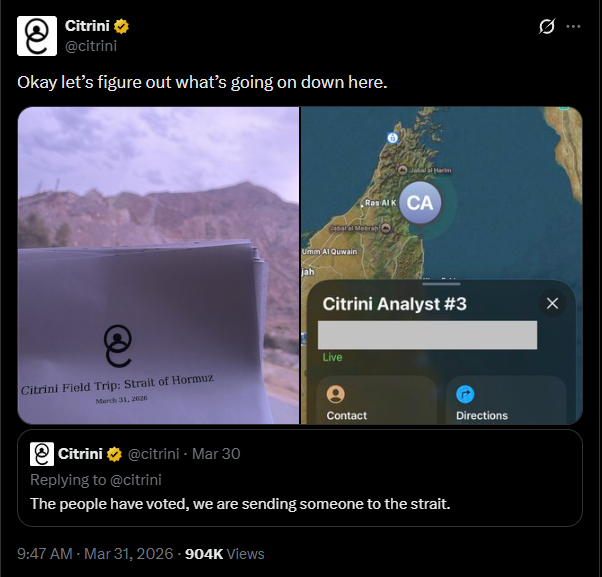 >The difference in Strait activity from when #3 first arrived / began observing the strait about 4-5 days ago to today is stark. Traffic has meaningfully picked up - there are still “dark” runs and ships transiting without AIS turned on, but there’s a lot more going along the coast of Oman. At least 15 ships have crossed, including at least 3 VLCCs.>When we arrived, virtually none were going through. Then a trickle through the Qeshm channel. It’s meaningful now, could be talking low double digit percent of pre-conflict volume. Meanwhile, expectations for a US operation involving “boots on the ground” within the next week or two are still high among locals. >When we first sent analyst #3 to the strait we were hopeful we’d get a clear cut answer - bullish or bearish, open or closed, war or deal. It soon became clear that was the wrong framework through which to view this trip. On the same day that we learned it was the broad expectation of nearly everyone in the region - from locals to informed parties - that US ground troops would be launching an operation (“boots on the ground!”), we also observed multiple ships beginning to cross the strait. Soon they weren’t just limited to the Qeshm channel.