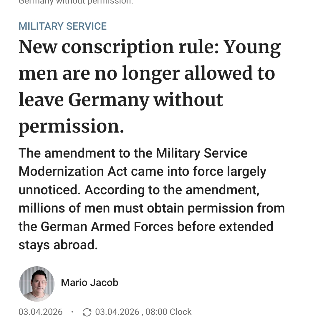 If anyone posts about this, they're trying to mislead you. This has been in effect since January.https://www.berliner-zeitung.de/news/neue-wehrpflicht-regel-kaum-beachtete-aenderung-hat-weitreichende-folgen-li.10028539