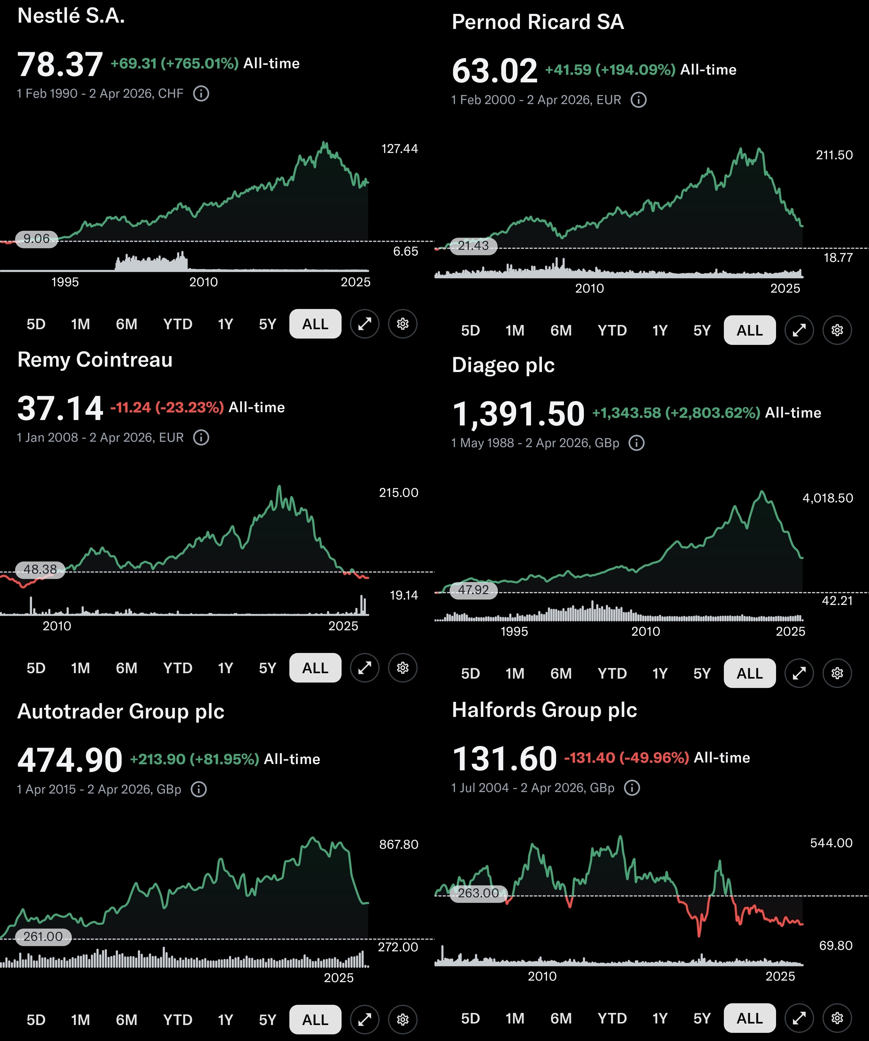 >>62075960I have Pernod Ricard and Remy Cointreux as a well. Im not too worried about them. Booze is one of the most universal constants through known human history. They're busy reformulating as well releasing things like lower alcohol spritzers and stuff.I suspect part of the reason their prices are down is money moving to tech and defense; they follow almost inverse curves. Part of my strat is just to park in booze for when the techerino bubble inevitably deflates again.