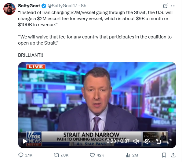 The US could pull off the greatest naval invasion of all time with zero casualties (we won't) and it'd still do fuck all for us because Iran can still hit targets in the strait from the mainland. It might even be worse because then we'd have hundreds or thousands of isolated troops that have to be resupplied constantly while soaking up drone strikes and the strait would still be closed.