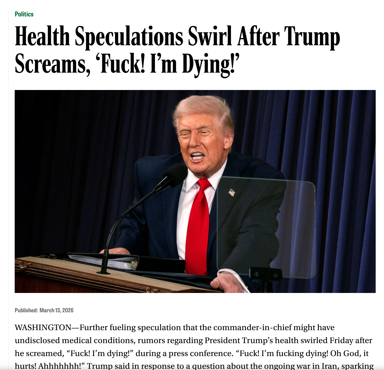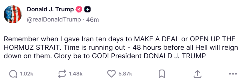 >"TALKS WITH IRAN ARE GOING FANTASTIC! I AM DELAYING NUKING IRAN FOR 2 MORE WEEKS AT THEIR REQUEST! THANK YOU FOR YOUR ATTENTION TO THIS MATTER"