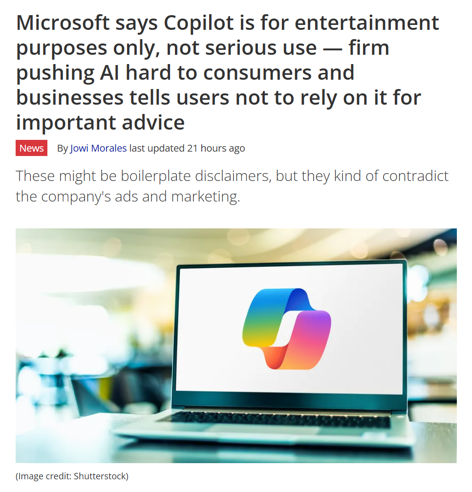 >AI isn't a bubble it's going to eliminate all white collar j-AAAAACCKKKKKK!https://www.tomshardware.com/tech-industry/artificial-intelligence/microsoft-says-copilot-is-for-entertainment-purposes-only-not-serious-use-firm-pushing-ai-hard-to-consumers-tells-users-not-to-rely-on-it-for-important-advice