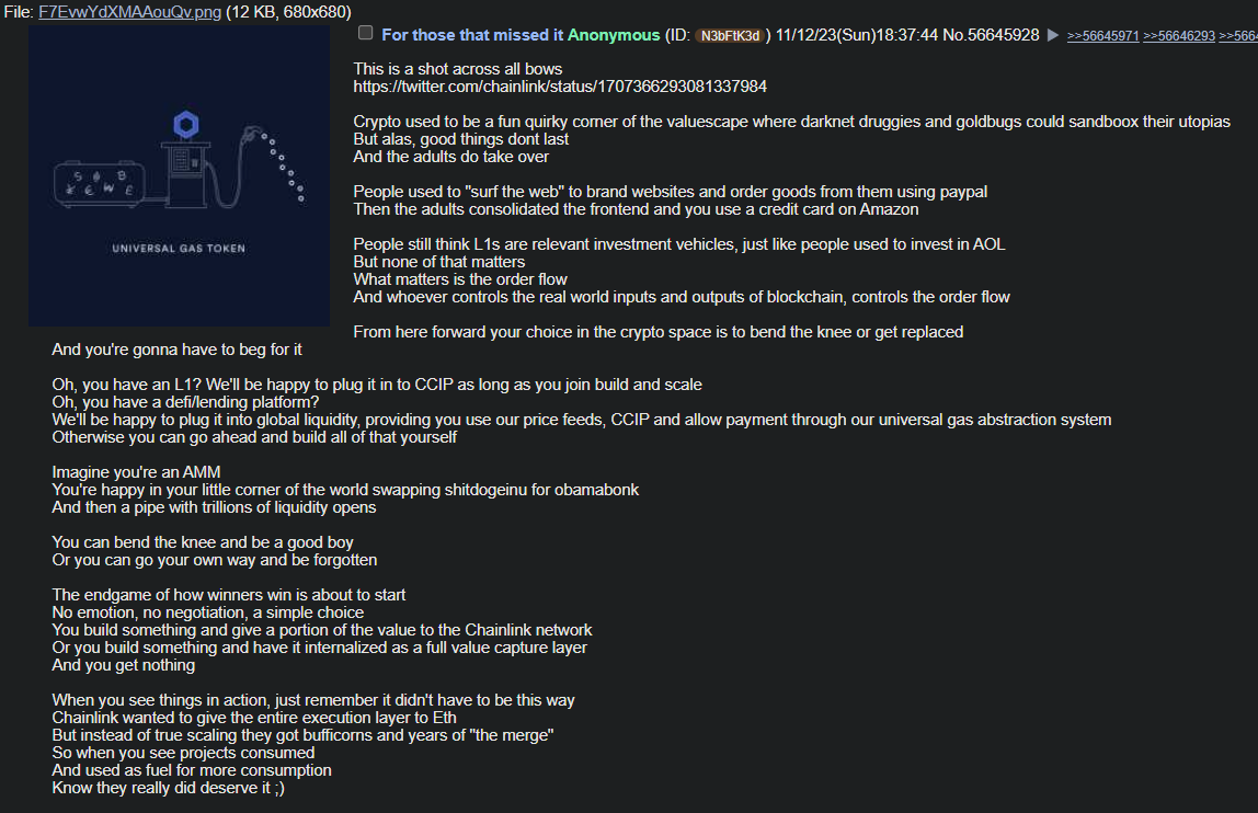 >>62090526Chainlink is literally an entrenching of jewish middlemanning and fee capture which is absolutely evil. The link token has zero utility outside being a toll booth and is just a random ETH coin that makes the process LESS efficient, friction injecting to be a parasite with zero reason to exist and zero actual utility or value conferred to token holders through use in price feeds or pilot projects, both of which amount to nothing