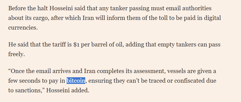Iran plans to require oil tankers passing through the Strait of Hormuz to pay transit fees in Bitcoin.