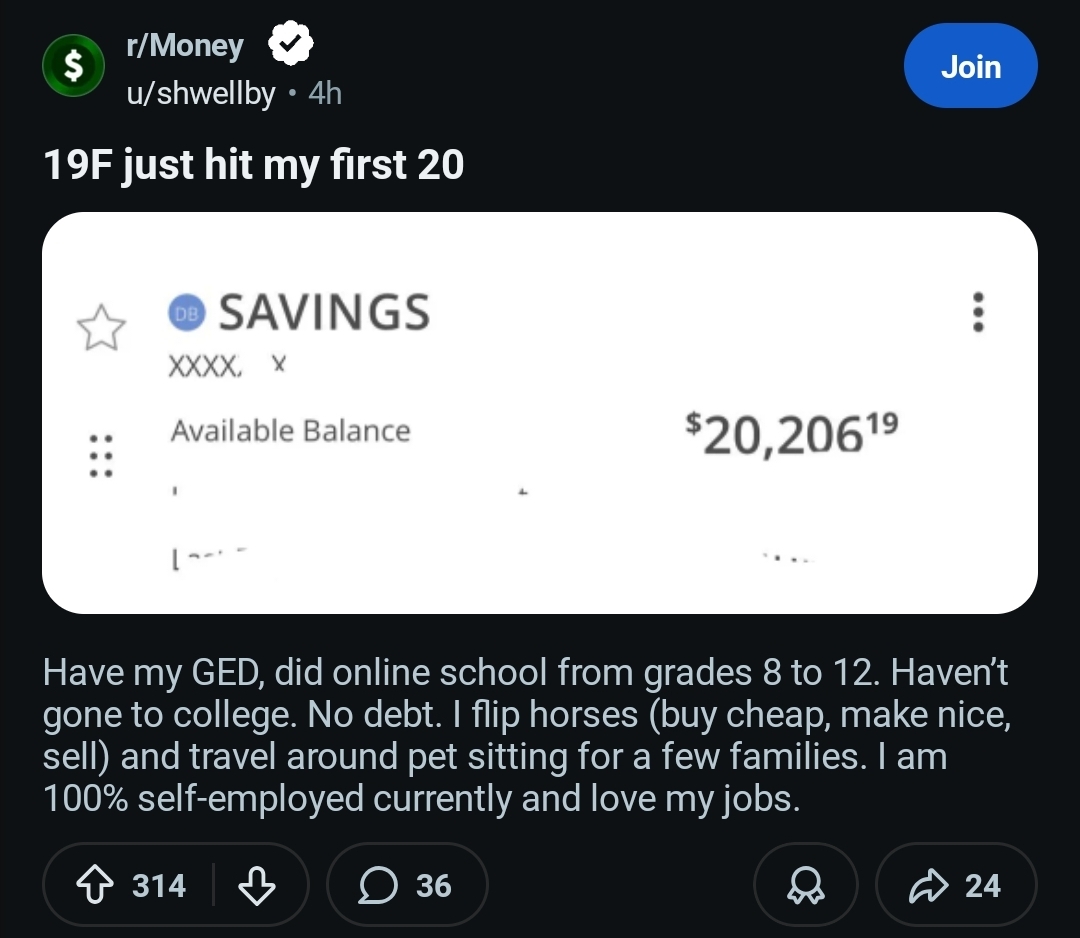 Basically the typical normie femoid has been a highschooler sent to be a do nothing colle student. Really if you lived at home after dropping out of high school it'd be pretty easy to save $20k+ from working a burger job while living with your parents.