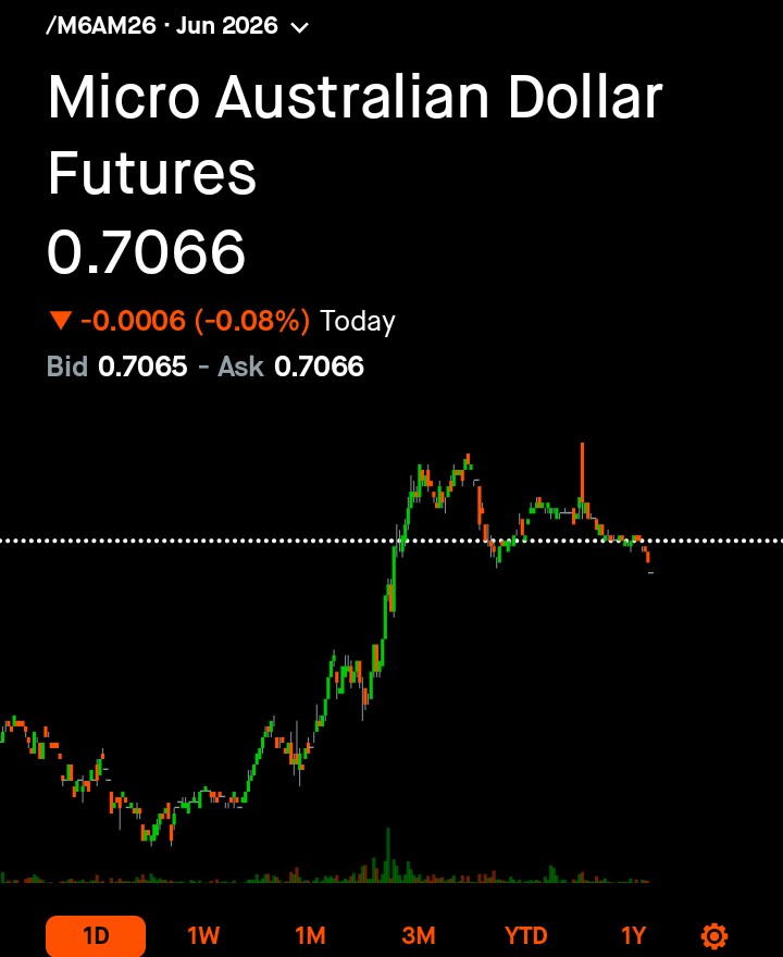 Today I placed a limit sell on AUD, at .7085, shortly before futures opened. Was hoping to catch some opening volatility.The order was fulfilled at .7090.Everyone on Robinhood can see my order as a red candle at 6:00 today. I think that's pretty cool.