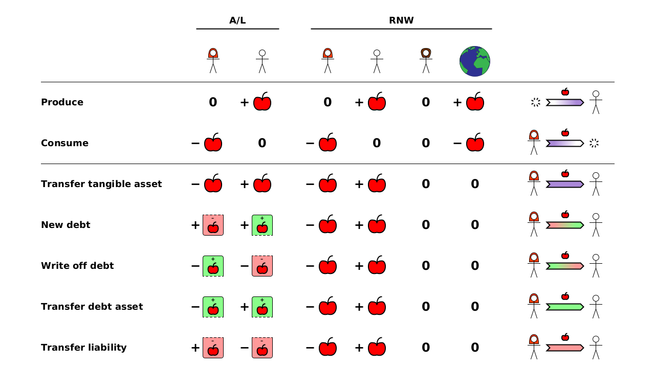 >>62102268>Ok where is resource scarcity accounted for ?Thanks for the question. Are you referring to raw materials like oil, coal, iron ore, wheat, etc.? If so, production actions (someone gains a tangible asset; nobody loses one) can only occur if those materials are available to mine/harvest.If you're referring to the scarcity of manufactured things, the total quantity is whatever's been produced to date minus whatever's been consumed to date.One thing to clarify is that the model doesn't try to predict how the state of the economy affects people's actions. Instead, it shows how people's actions determine the state of the economy.People's actions in the model are exogenous (independent variables), like forces in Newtonian mechanics. Newton's laws don't tell you that a human can't push an object with a force of 1TN, but it does tell you what would happen to the object's momentum if they somehow managed to do it. Similarly, this model doesn't tell you what things people are able to produce, transfer or consume, but it tells you exactly what happens to what everyone owns, is owed and owes if they do manage to do that.One of the most important results is that, apart from production and consumption, all actions are zero sum for "raw" net worth (what people own + what they're owed - what they owe). Combined with the linear composition, this is a very powerful result e.g. QE is zero-sum at the macro level.