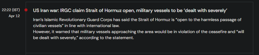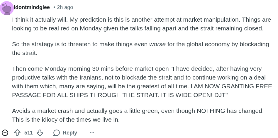 Interesting developments if Iran claims that the strait is currently open. I guess that may not be permanent and the assumption was that Iran would've wanted to toll and control the strait long-term, which USA wouldn't want. I think now that it's pretty clear that Israel won't end this until Iran gives away its enriched uranium as strait of Hormuz being opened seems like a very plausible part of negotiations. Now I'd assume that the goal is to take away the uranium somehow, which may prove very difficult, so USA may just want to take control of the strait now and deal with getting the enriched Uranium later on as it'd probably remove much of the urgency.Either way I think that oil getting through Hormussy is still very likely to happen within a couple of weeks, though the conflict self may take much longer to resolve. Maybe, just guessing, would make sense to me.