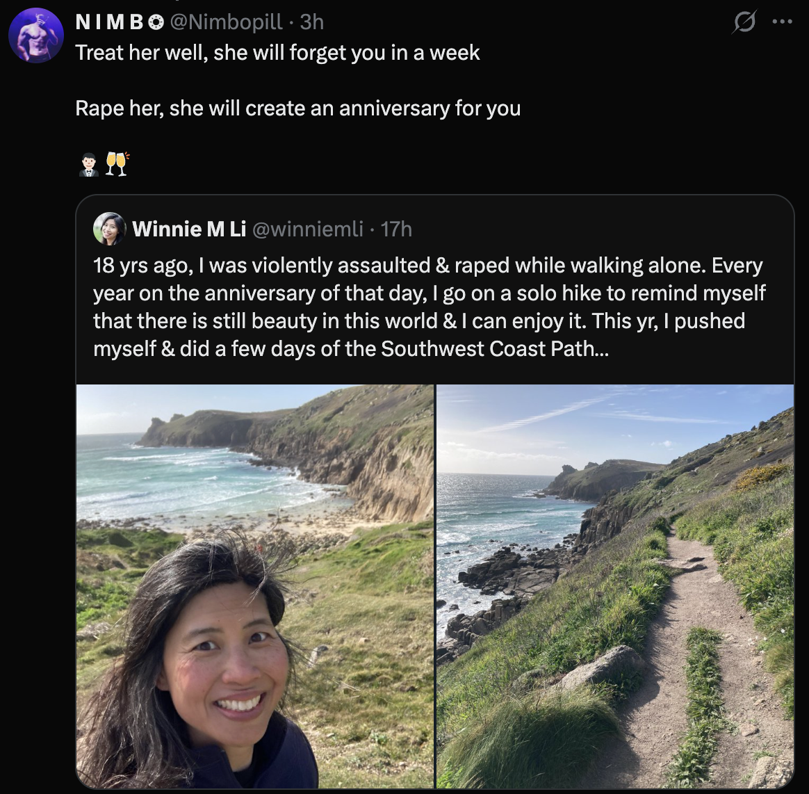 >>62107840>oh, i hope no one rapes me again when i walk the>PACIFIC COAST TRAIL ALONE ON TUESDAY AT 1230 AM IN THE LITTLE SHED AT 33'24'98 12'23'99