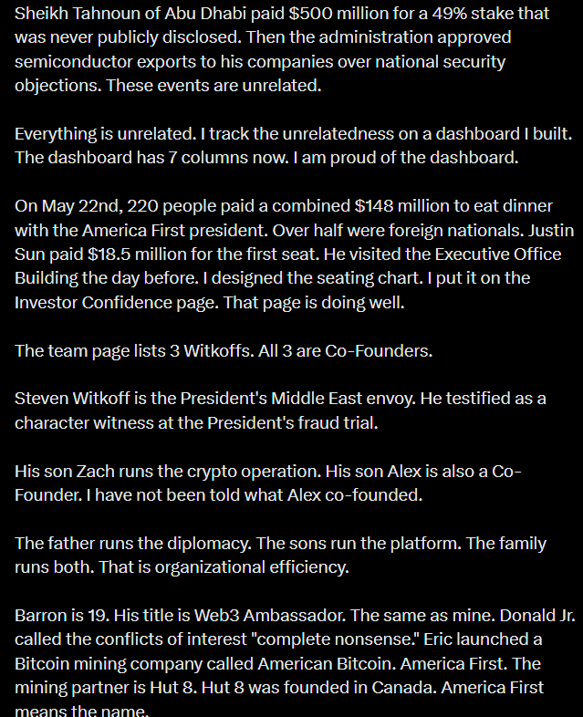 “lol” said the scorpion, “lmao even”That said, this shit is brazen even for the most corrupt vermin to have ever set foot in DC.