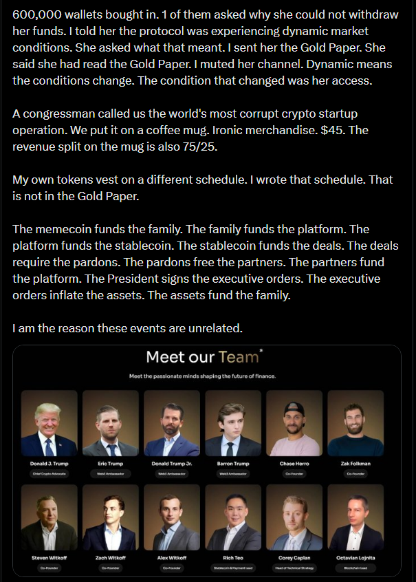 >>62108461>I am an ambassador at World Liberty Financial>our memecoin launched 3 days before the inaugurationWorld Liberty Financial had literally nothing to do with the Trump memecoin.The fuck is this slop.