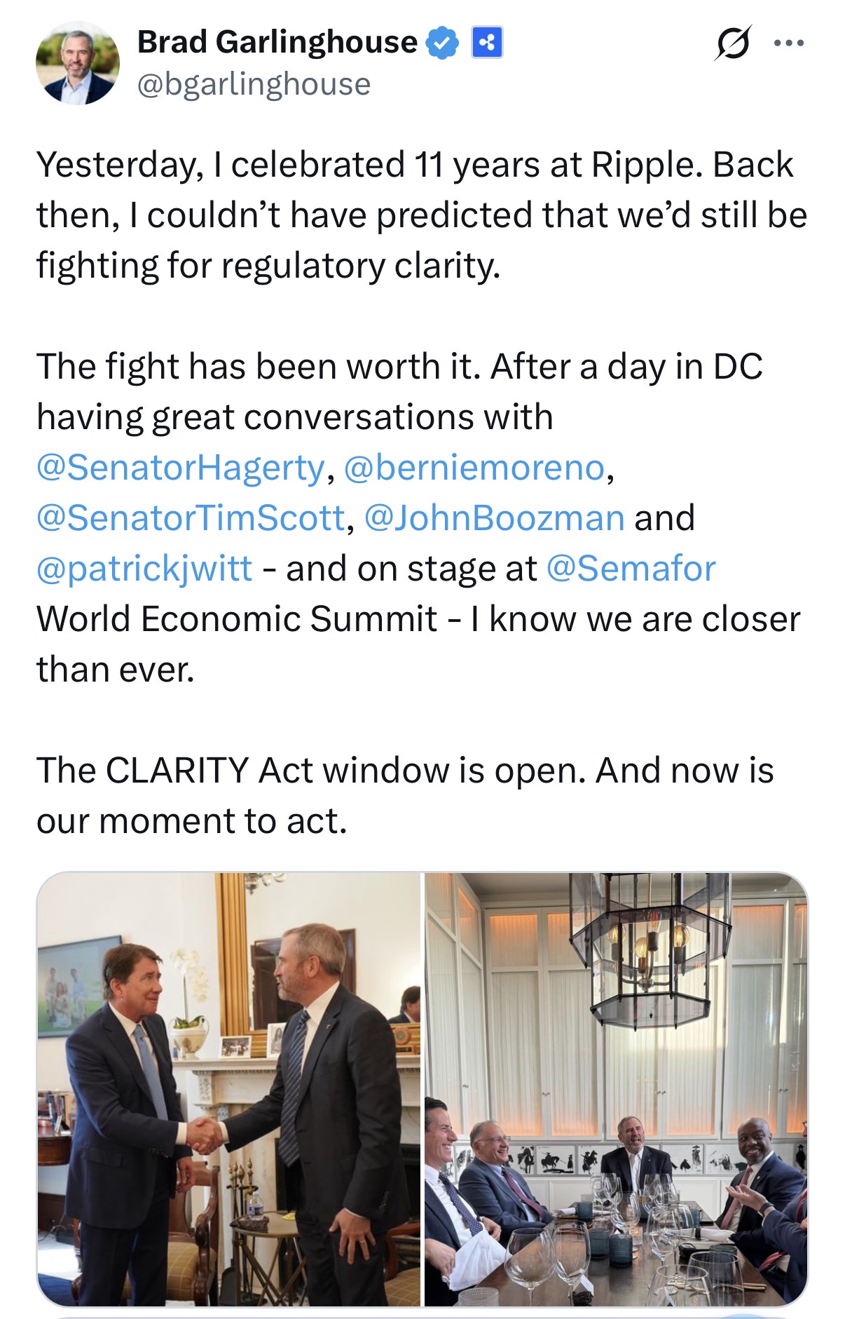 the clarity act is still in the far future, but here is some clarity as an appetizer: banks won't buy the token, it only exists because sergey wanted to skim some of the retarded hype money for himself. you fell for it, he has your money and you have a mental disorder that makes you unable to admit to yourself that you've been had