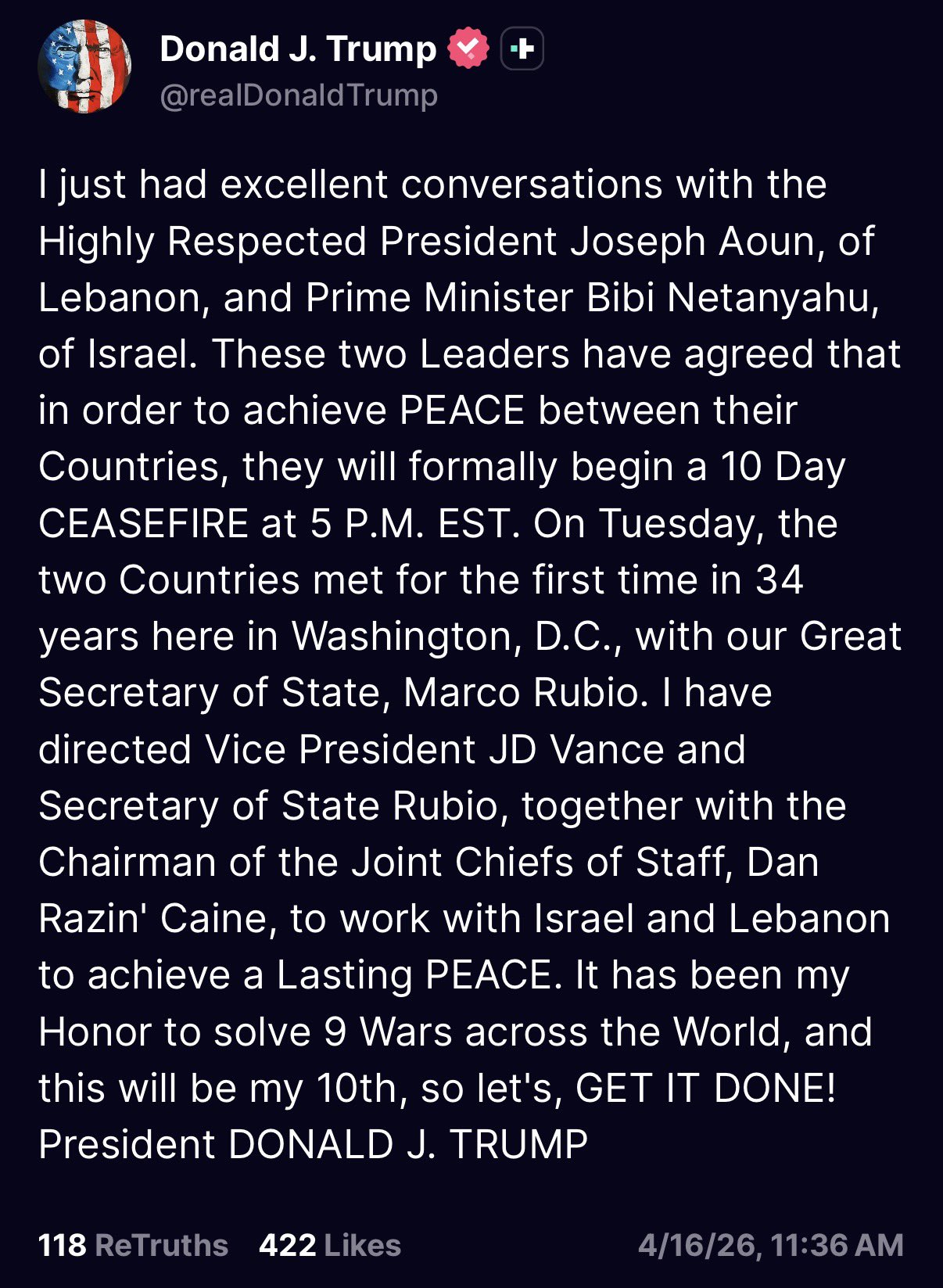TRUMP ANNOUNCES CEASEFIRE BETWEEN ISRAEL AND LEBANON