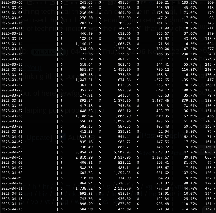 >>62122081My first account that I ran the bot on for exactly one month has $498k volumeSecond account that ran for 12 days has $334k volume Current account has run for 2-3 days and has $39k volumeI don't believe airdrop is going to be worthwhile but we can hope>I have seen lots of profiles that must be using bots where they made like 30k in 6 months with a volume of a couple million dollars kek.For sure, 99.99%+ bots. >>62122099Python. Don't listen to people saying you need rust or c++ for speed because that's only really needed for market making. You shouldn't do anything related to market making unless very experienced and ready to put down a lot of money and time. Start with a simple script trying to execute one strategy only. Use AI to help you piece it together bit by bit. First obviously make sure your script can connect to the API, read book prices, and do take or maker orders. My very first script did one shitty strategy that got maybe 4 trades a day. When I confirmed it was profitable over time I just copypasted the entire script and adapted it for a different market. Then I got confident enough I could make decent money I made a proper multistrategy bot. Worked on it for 6-12 hours a day for a monthWhen you start reading about other people's strategies to get ideas for your own, you're going to find a lot of disinfo and AI slop. Bad actors want to profit off you by getting you to use compromised github scripts that steal your private keys, or just generating slop for the ad revenue.Also, simple strategies are the real ones. People talking about strategies with 4-5+ technical signals are lying or bots generating slop that looks impressive to newbies. I'm pretty sure all of my strategies only use one or sometimes two signals in combination with very basics like used time / time left / scale of signal of current market