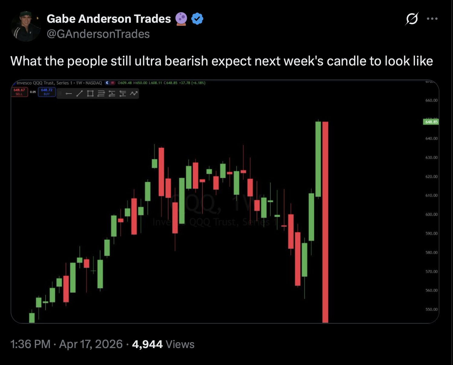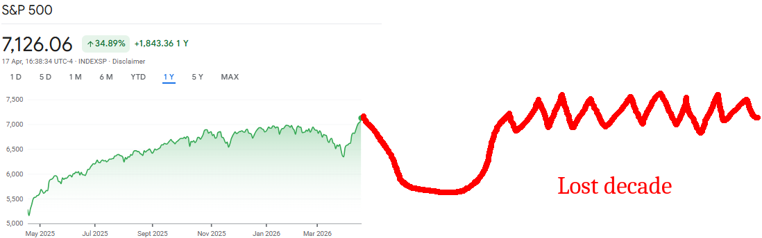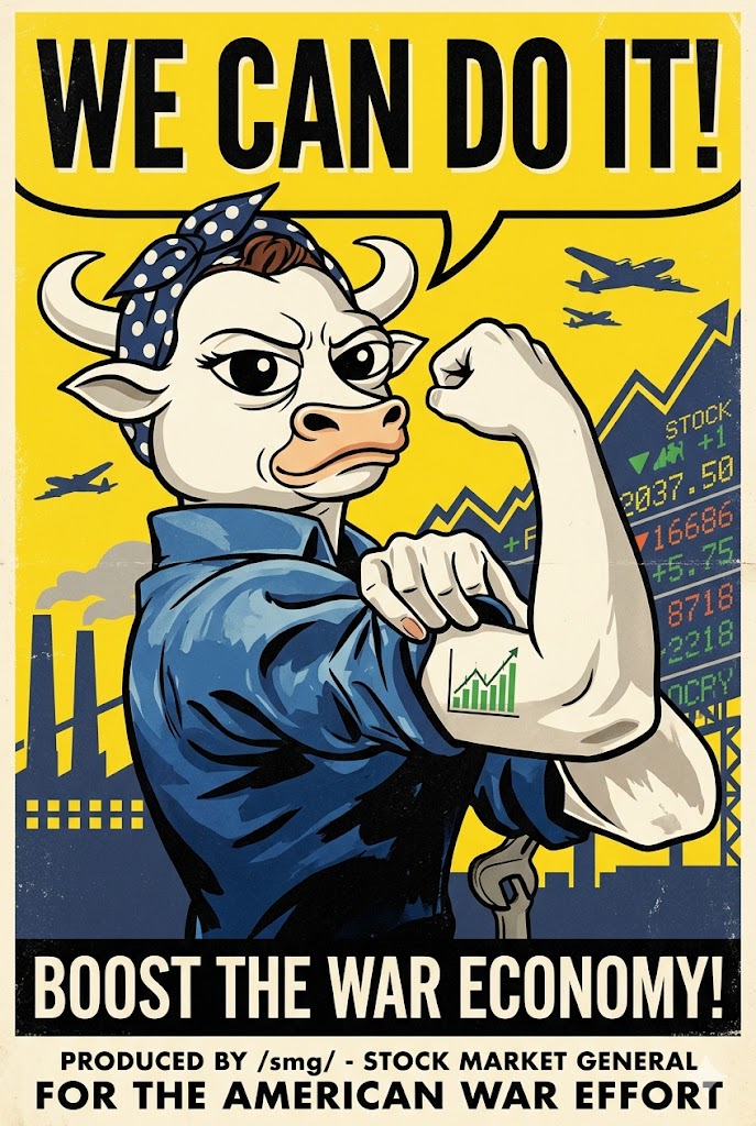This is a vision of your future.Next week - Hawkish Tump, destroyer of worlds returns after Iran rebukes his statements on their total capitulation and uranium handover. Oil begins to rise, stocks selloff.Last week of April - Oil tops at $130, SPY bottoms at 640.May - A real actual peace is agreed and we fucking moon to 8,000 and beyond.