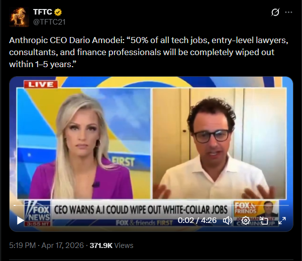 >>62128111He's bullshitting and just pumping his stock value. Guy has been saying for years that we're 6-12 months away from 50% unemployment. If you listened to his opinion in 2023/24/25 you would know he's a complete bullshitter