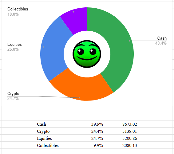 21k worth of assets isn't anything to give much thought about diversifying and percentages.Keep an emergency fund cash and the rest in index funds and forget about it.Live your life, increase your income, add to your pot when you can.