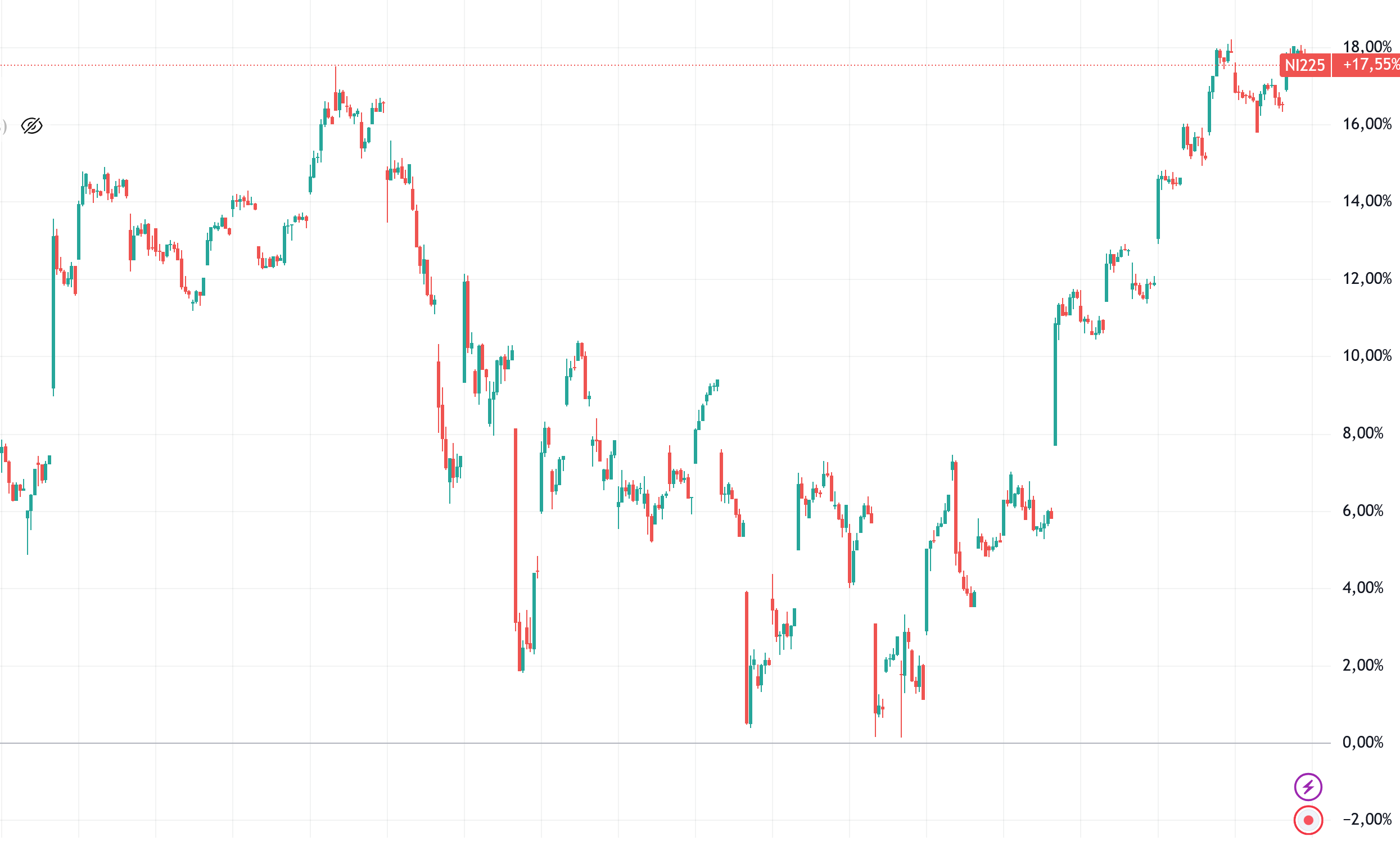 >>62139272The Japanese and Korean markets were the funniest ones.Look at the Nikkei, nightmarish -5% then +5% candles on the whole fucking index day to day. Absolutely nightmarish for Hiro, especially if he was leveraged.Also, the fucking Nikkei going from 30 000pts to 60 000pts in a single year? HELLO?And no, JPY going down is not enough to explain that retardation. But I'll give it to Buffet, he was right somehow.