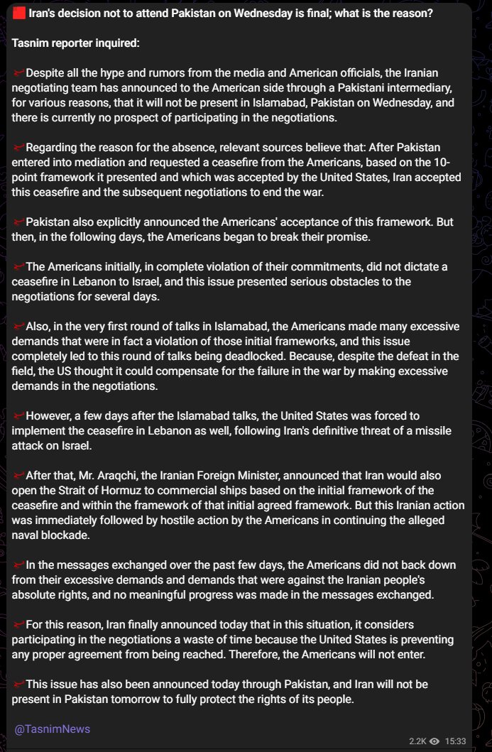 IRAN'S DECISION NOT TO ATTEND WEDNESDAY'S MEETING IS FINAL - TASNIM