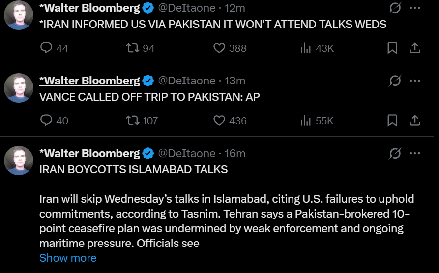>>62139776I went from being up 300 bongs to being up 40 bongs at which point I sold immediately after seeing the news release of Iran boycotting the talks.I'm full cash until this is over. I want slow but steady gains, not megacorps trading like shitcoins in what is essentially a complete fog of war since the president of the USA is pump-and-dumping the entire fucking nasdaq.