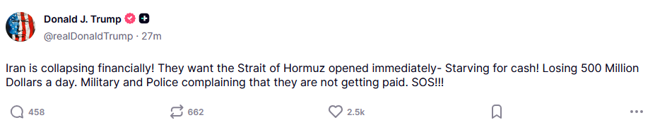 >until such time as their leaders and representatives can come up with a unified proposalPossibly never, not if you do not "purge" the IRGC, which you'd need military action for.45 prior to his TACO Iran said they would not come and oil pumped. Then he posts about an extension TODAY even though he already for no reason at all extended the deadline by one day onto wednesday and not tuesday at it should have been for a 2 week ceasefire. He had one day to delay, but he did today because of oil lmao, >it was pakistan!
