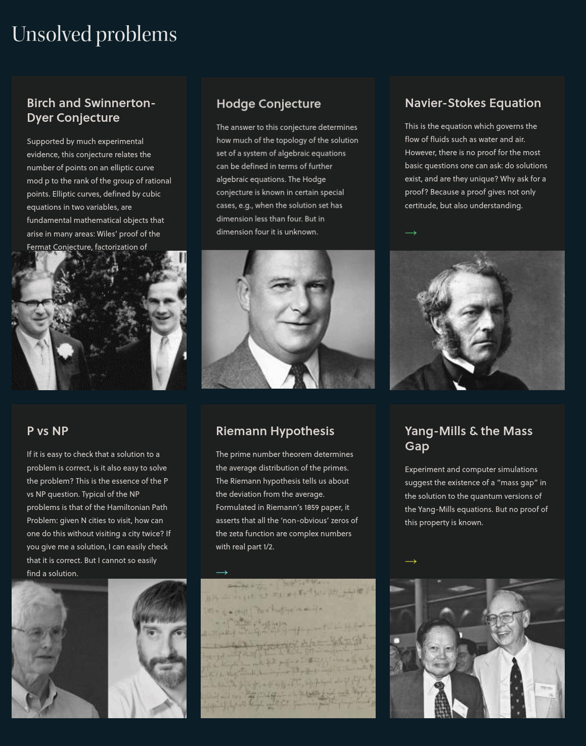$1 Million for each solution. Protip: Birch and Swinnerton-Dyer Conjecture is the most solvable of these 6