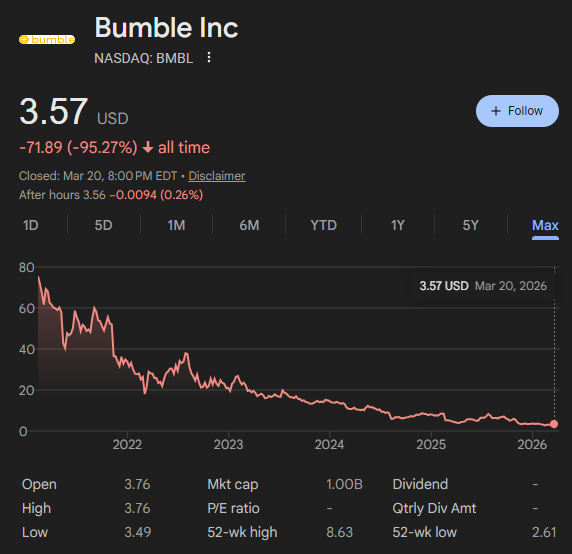 >>62159807>>62159815>>62159862>>62159934>>62160059The real reason Bumble died is because they had a class action lawsuit against them claiming that women having to make the first move was sexist. No, I'm not joking. This really happened. Now anyone can message first and it basically became a worse tinder, and the men all left, since the only reason to use it was to weed out all the women who weren't as serious about going on dates or hooking up. Everyone uses Hinge now since you only get 5 likes a day, so people are more likely to deliberately choose people instead of mindlessly swiping on everyone.