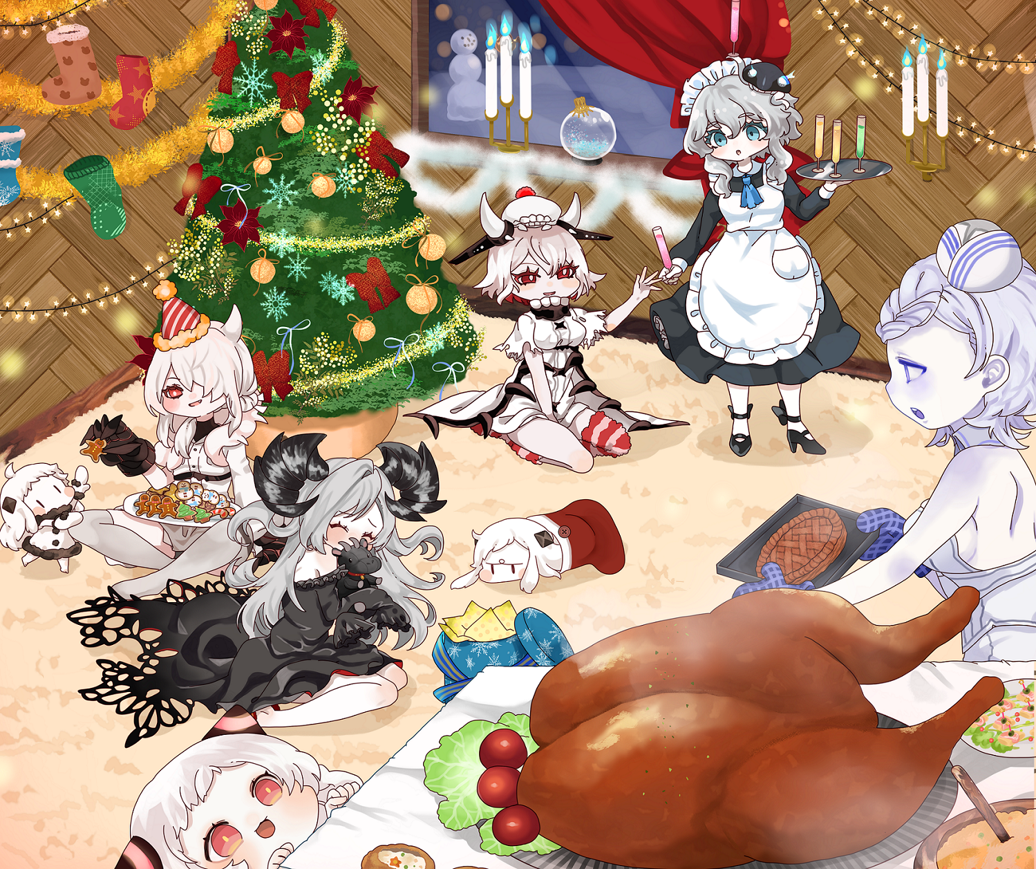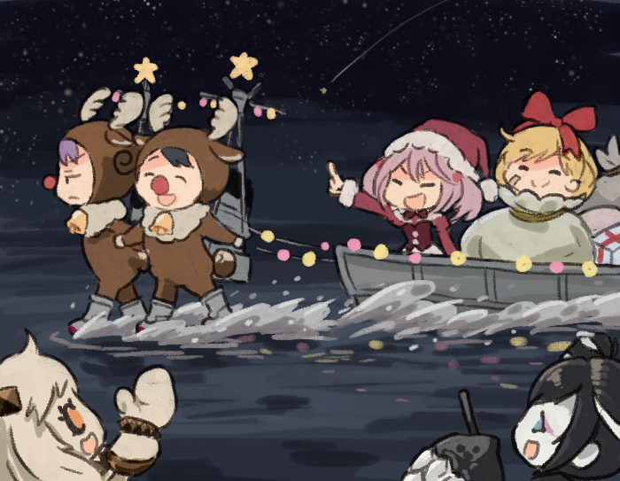 And lastly this one showing the abyssals having fun before dinner, by Kobone. Plenty of obscure abyssals were included like Abyssal Pacific Princess, Mediterranean Dreadnought Princess getting a totally-not-satanic goat plush for Christmas, Remodeled Wartime Cargo enjoying some cookies with Hoppou and French Light Cruiser Princess.