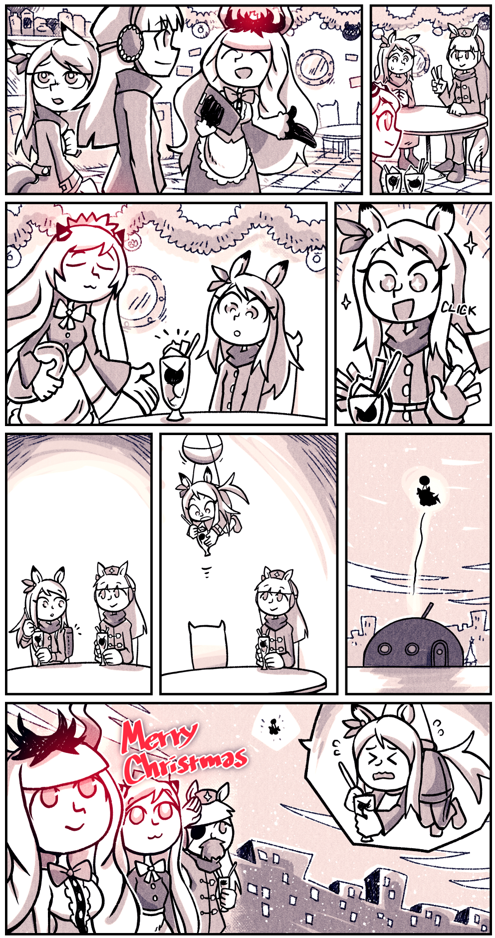 First two are once again a crossover between Umamusume and the abyssals. Nimbus Princess wanted a pony for Christmas really badly so Lycoris and Airfield orchestrated a situation to get their hands on a pony. Drawn by Setz.