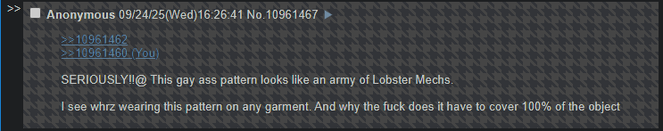 SERIOUSLY!!@ This gay ass pattern looks like an army of Lobster Mechs.