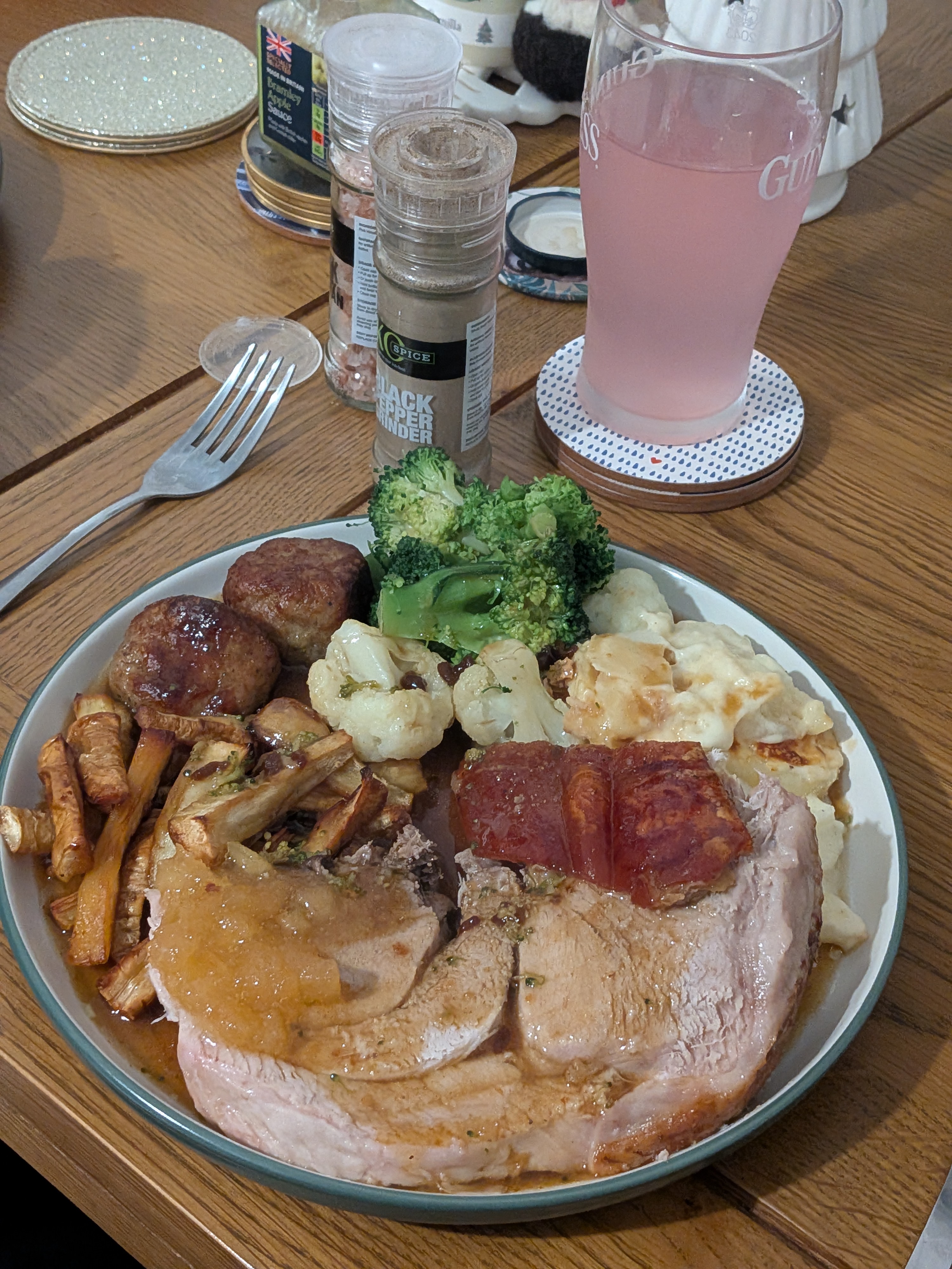 Me Din DinsRoast Pork with crackling and apple sauce, Gratin Dauphinois potatoes, sausagemeat stuffing balls, honey roasted parsnips, broccoli and cauliflower.Fuck me lads. Bosh.