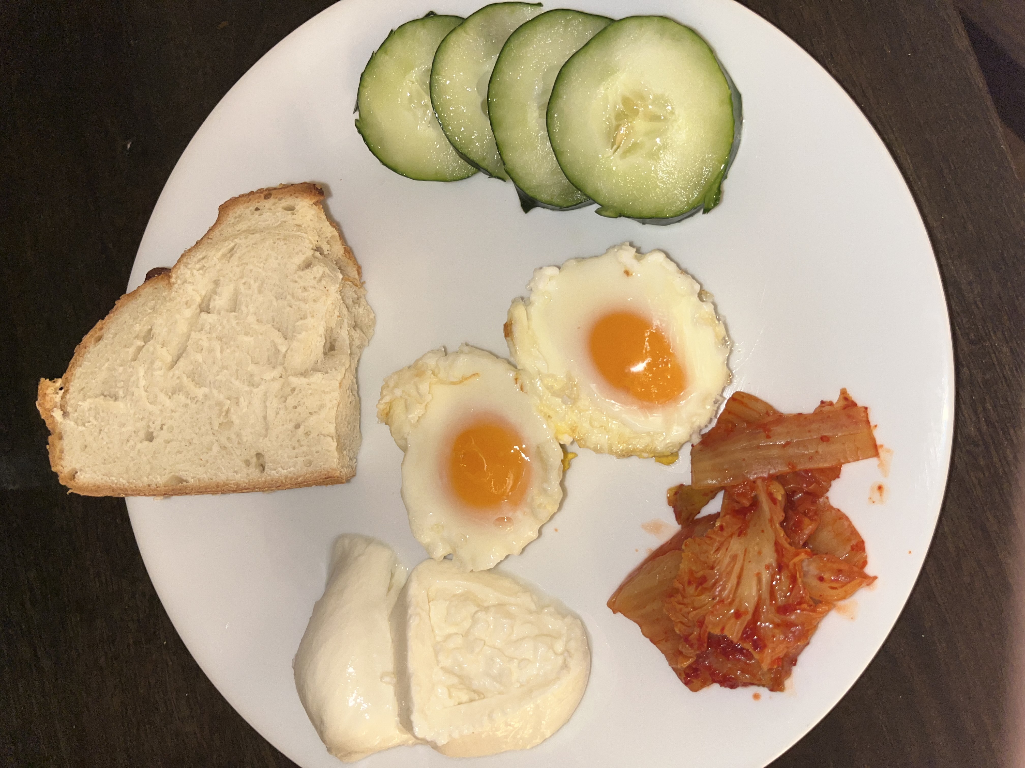>>21805707Sliced cucumber, buratta, kimchi, fresh bread, baked eggs.