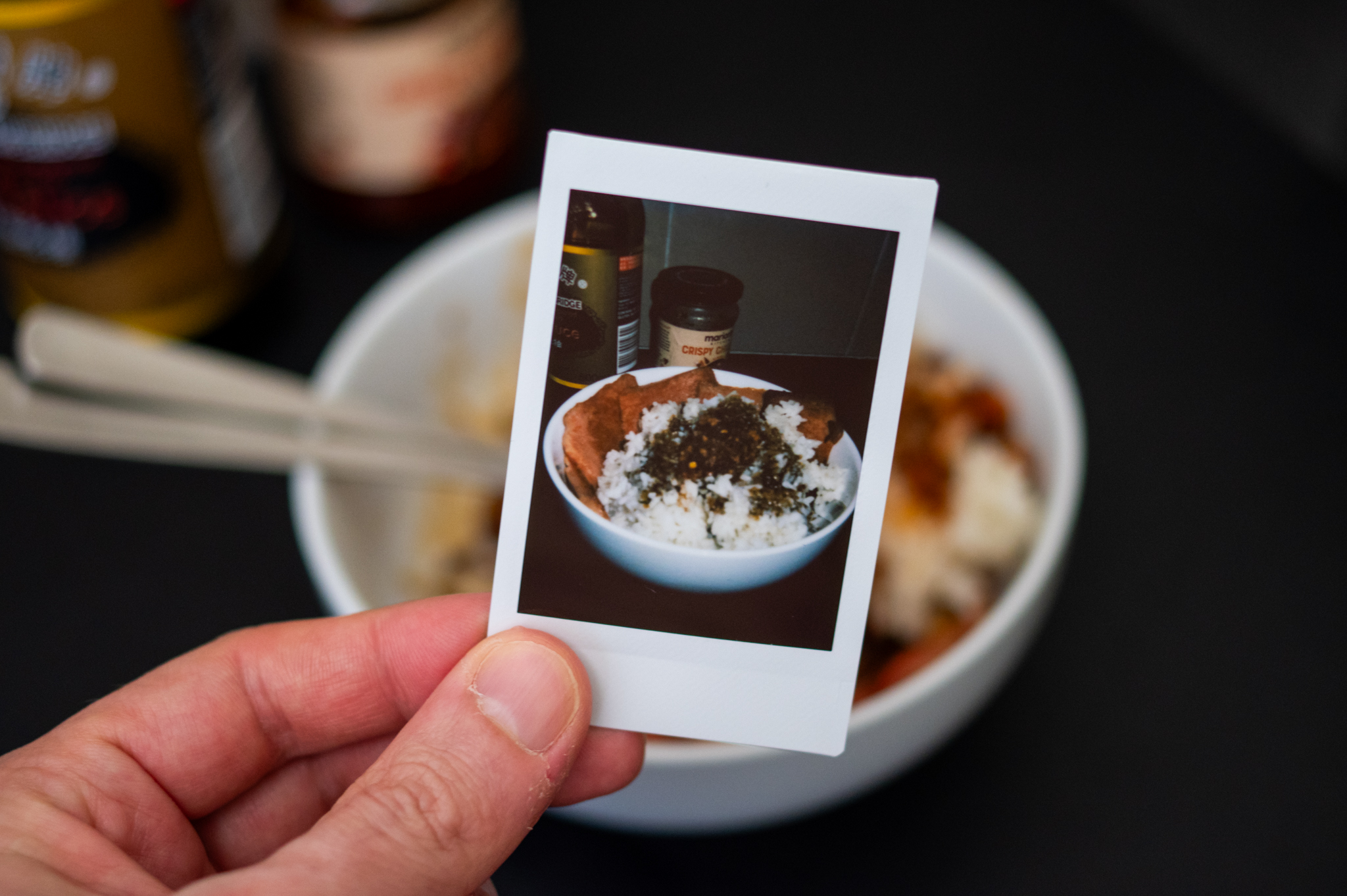 I had some thin-sliced bacon SPAM panfried until crispie and served with steamed rice, mushroom dark soy, and a blob of chirry oil.I needed the salt after yesterday's booze