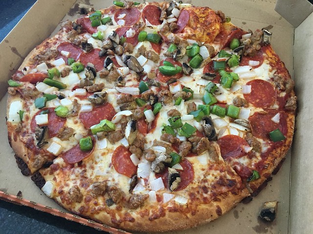 Little Caesar's ultimate supreme 'za, straight off the rack and into the car for consumption. yeah or nah?