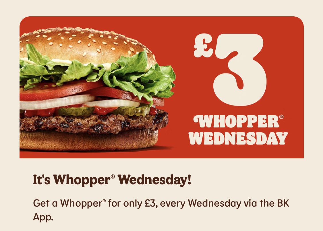 Just a quick heads up, BURGER KING® is now offering a WHOPPER® every Wednesday for only £3 when purchased via the BK app. Their famous flame-grilled beef patty, topped with tomatoes, fresh cut lettuce, mayo, pickles, a swirl of ketchup, and sliced onions on a soft sesame seed bun.I certainly know what I’ll be eating today and I’m having it my way!!!