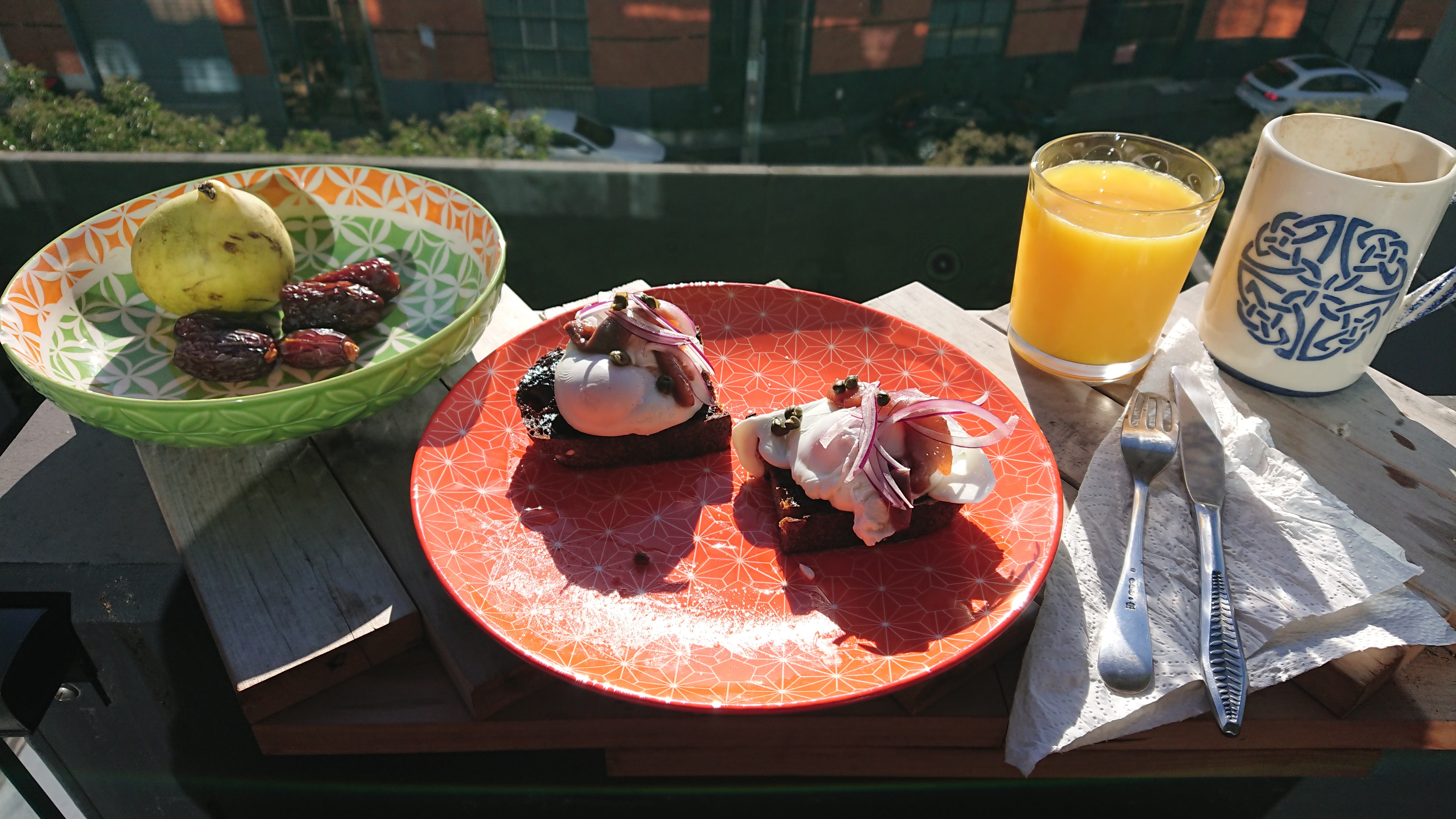 Good Morning Sirs. Poached eggs with anchovy-spiced pickled herring and a fruit bowl with fruits.