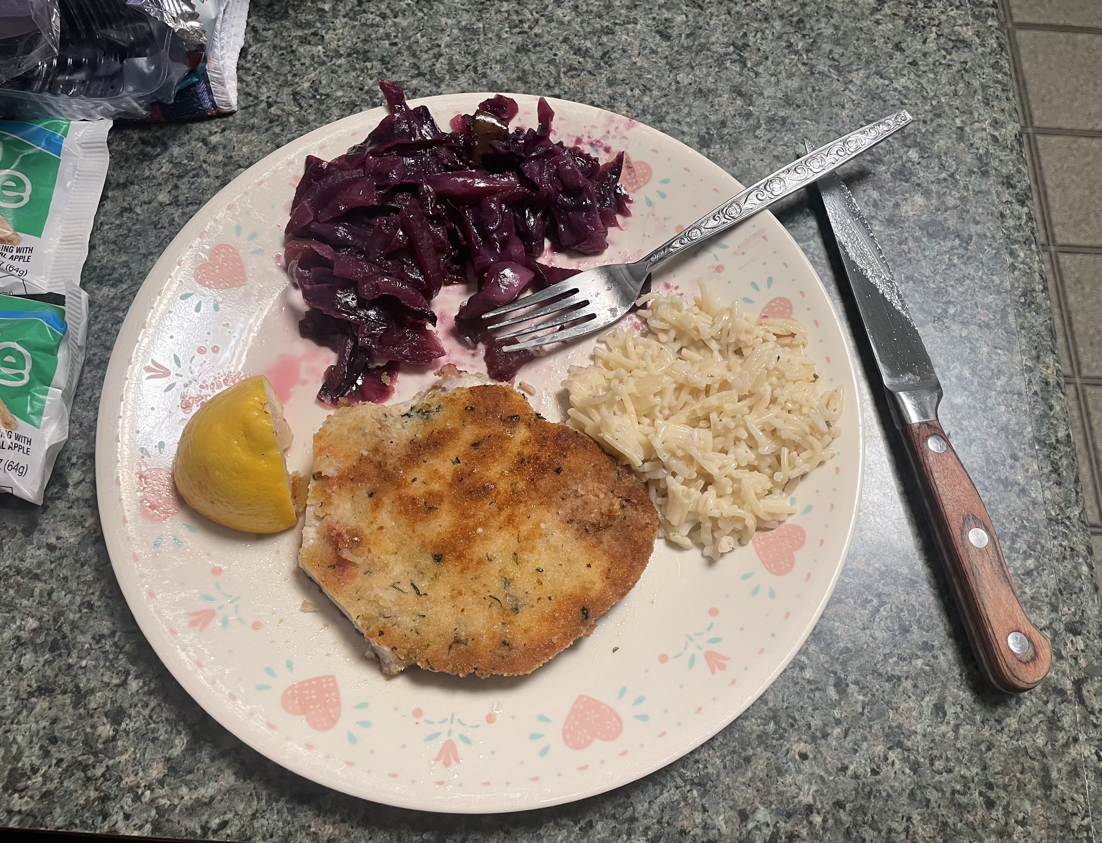 Boneless pork chop which I tried to flatten to 1/4 inch think but only got to 1/2 inch, sweet and sour cabbage, and Knorr’s parmesan rice. Gotta say the best thing is the knorr’s.