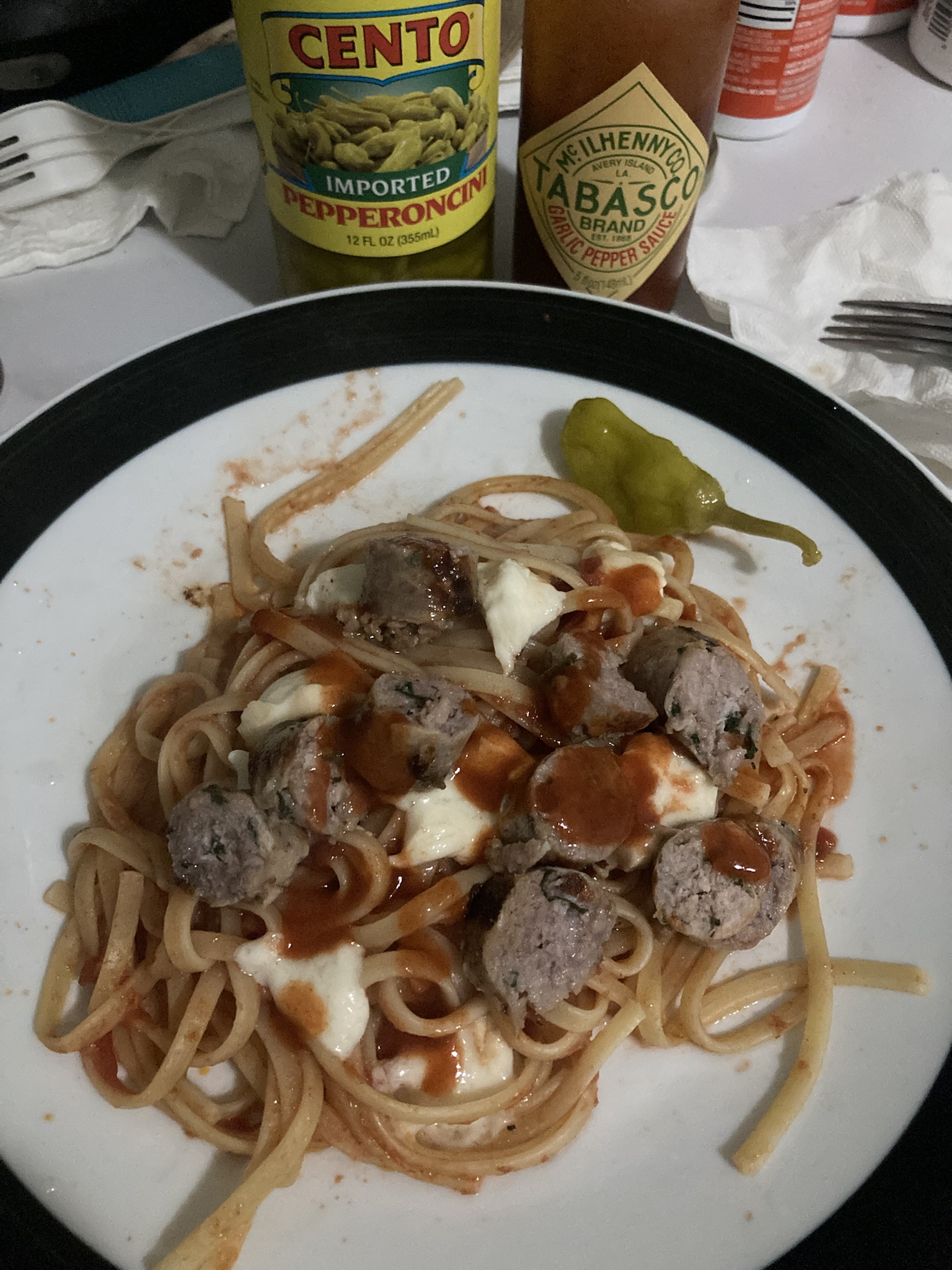 Linguine à la anon: with marinara from a local Italian deli, cheese and parsley sausage from the same deli, smoked mozzarella, dashed with garlic Tabasco and garnished with pepperoncini.