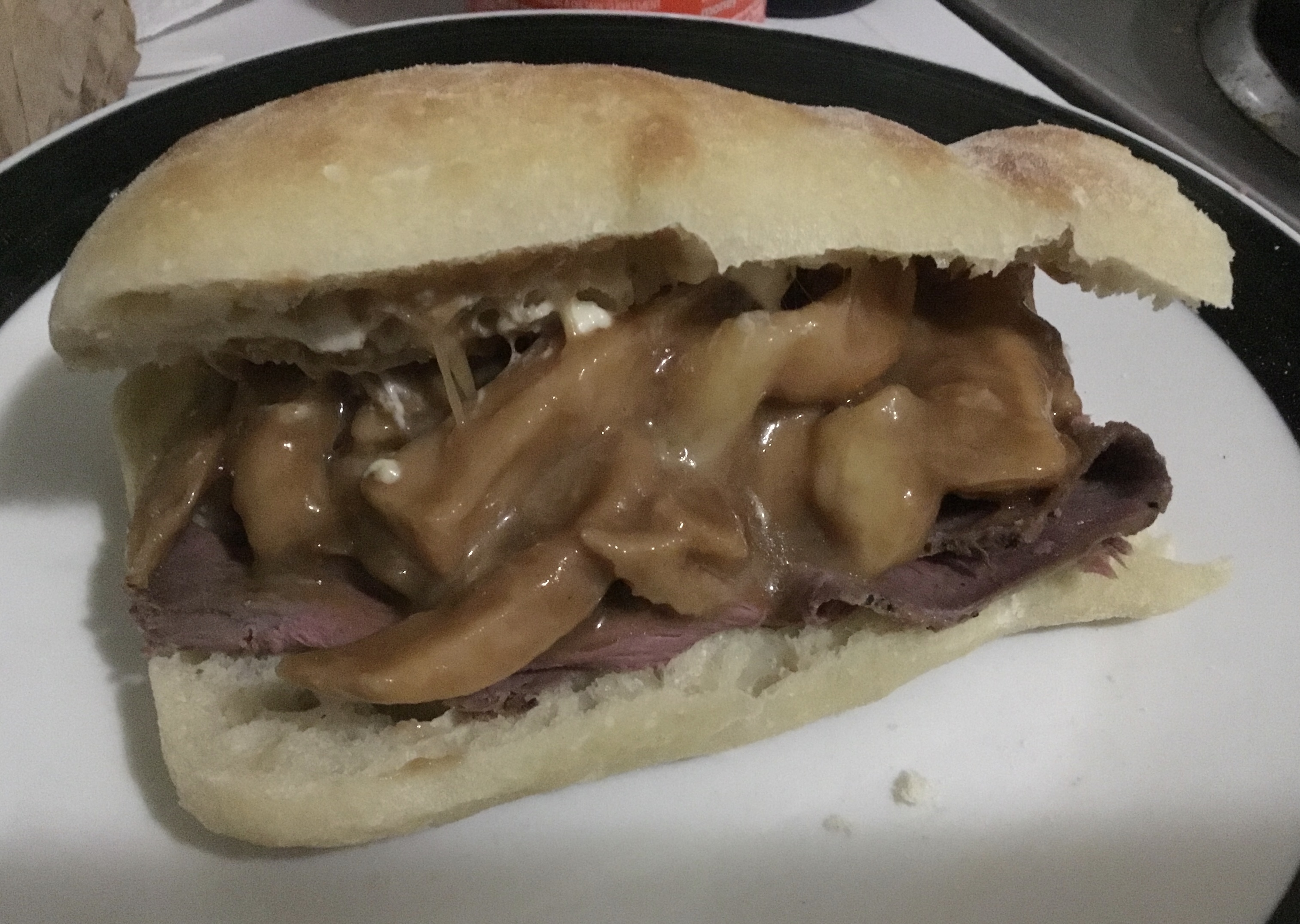 Tonight, it’s London broil with mushroom mayo, mushroom ketchup (look it up), and leftover poutine on a baguette. Since it’s reheated poutine, the cheese all melted, which is fine for this.