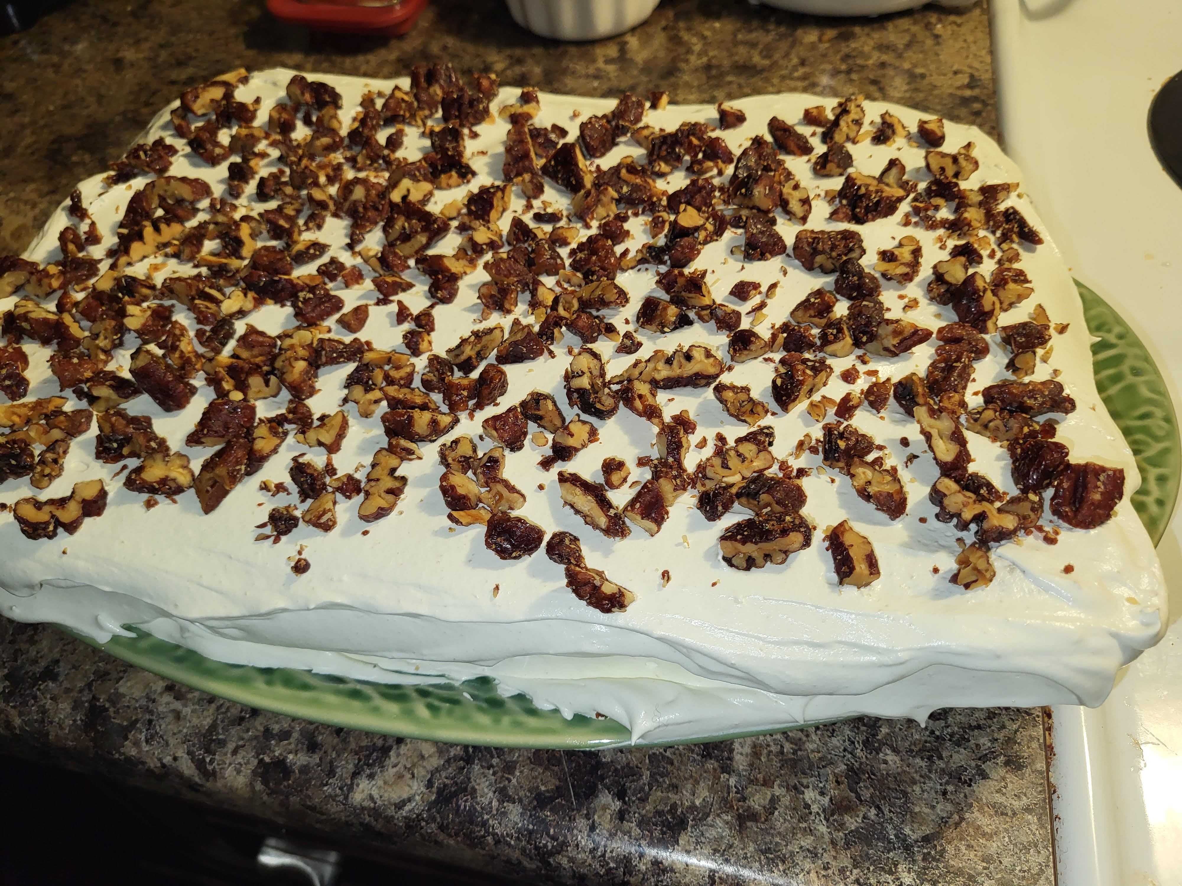 I forgot to get a cross section, but this is a pumpkin cake with chai iitalian buttercream and candied pecans I made recently.