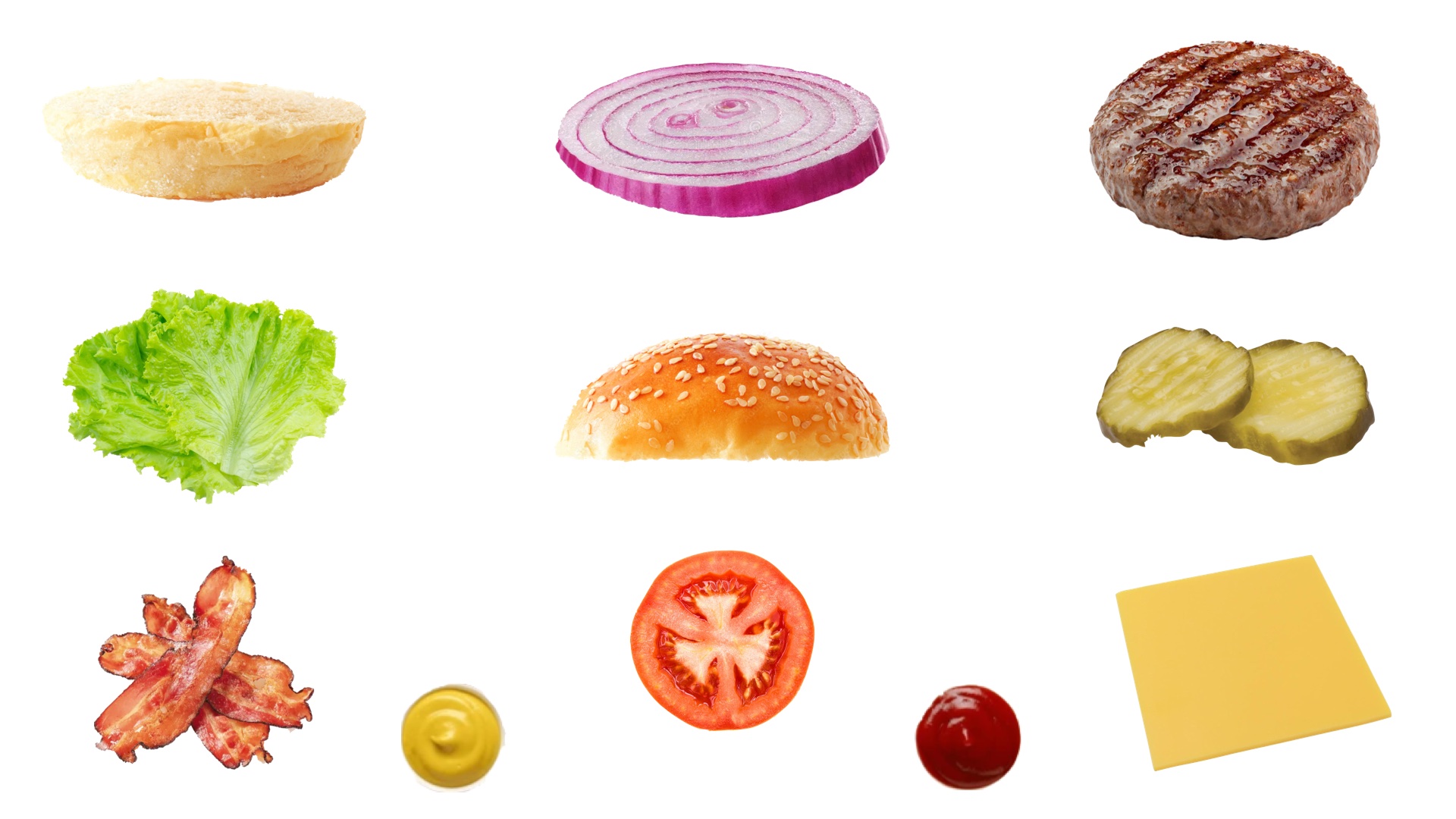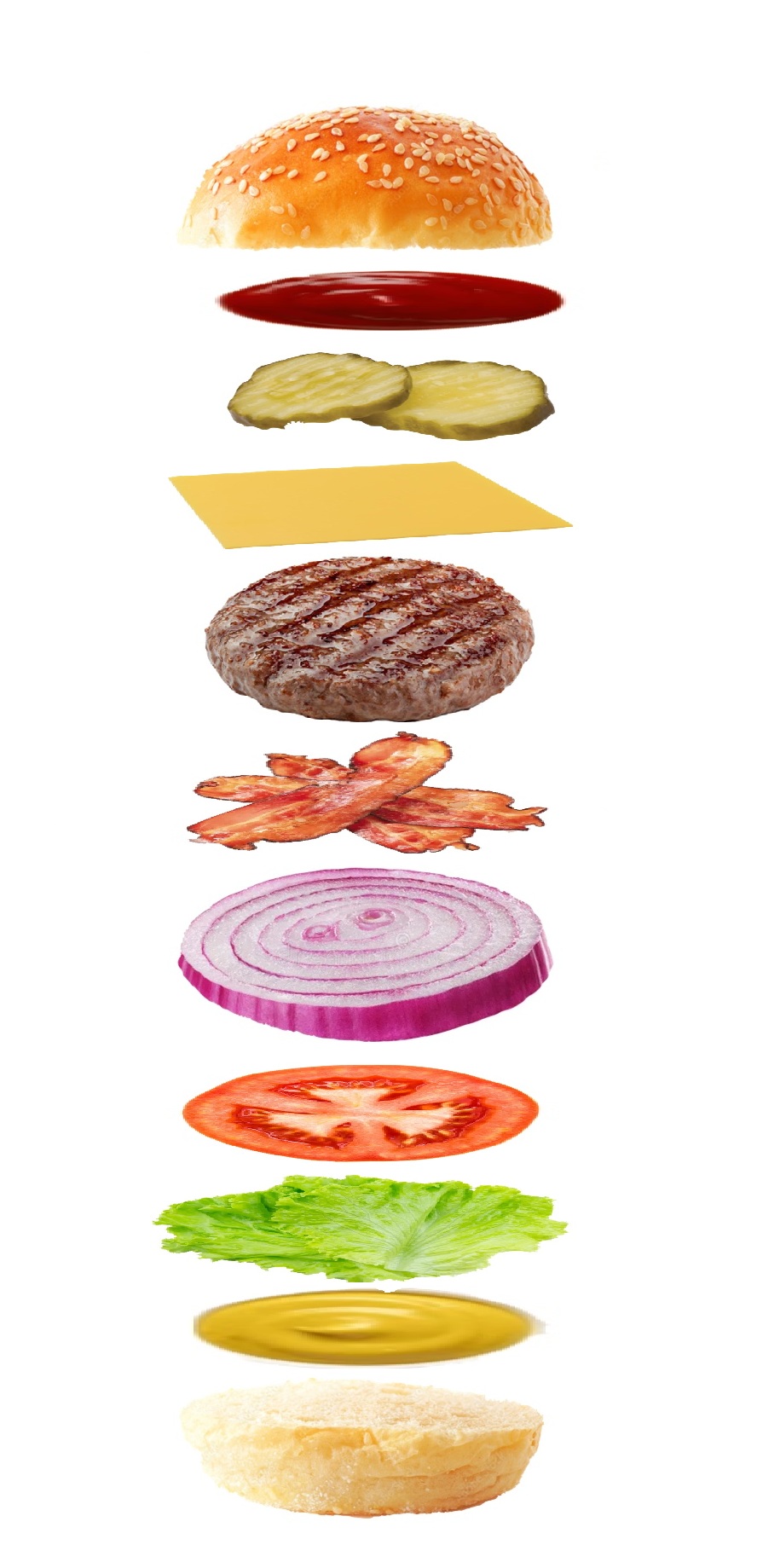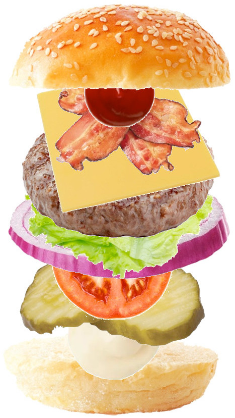 >>21659798Bottom bunSaucePattyCheeseLettuceTomatoOnionPicklesBaconTop bun